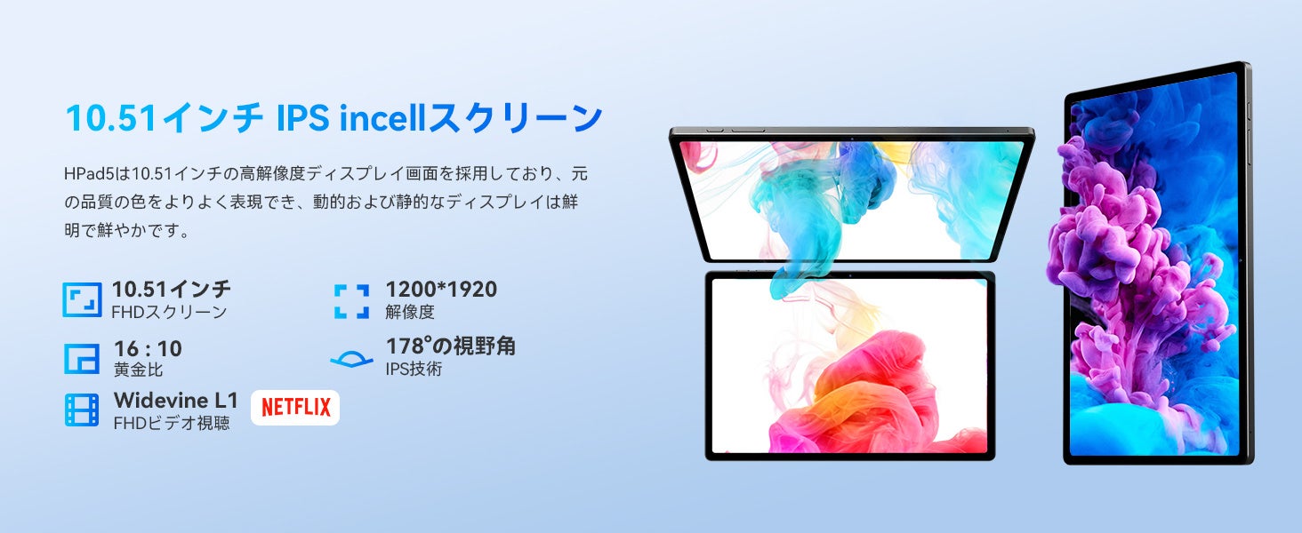 Hpad5はWidevine L1をサポートしており、Netflix、HBO、Disney+、Amazon Prime VideoなどのグローバルなHDメディアストリーミングプラットフォームで1080P HDの映画をいつでも視聴できます。10.51インチの大型ディスプレイ、16:10のゴールデンディスプレイ比率、最大1920*1200の表示解像度で、細部のビデオも繊細かつ鮮明に表示され、色の再現性も非常に高いです。
