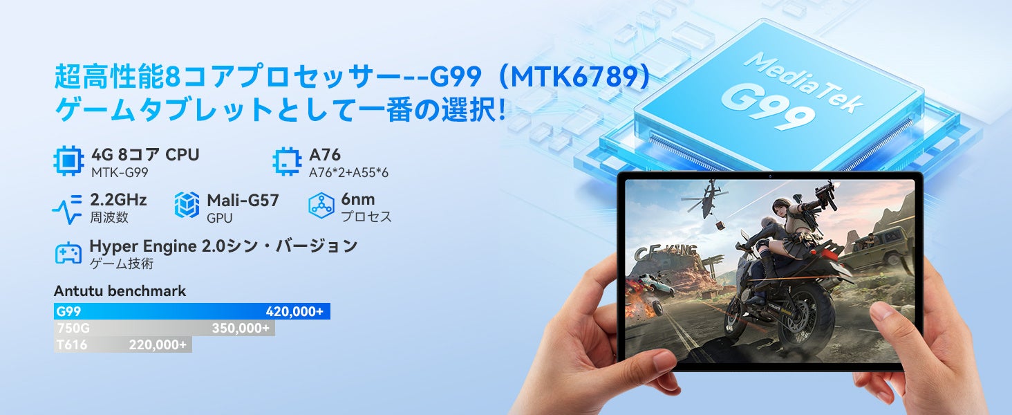 Hpad5は、現在のトップクラスのオクタコアチップ、Helio G99を採用しており、6nmプロセス技術を使用しており、パフォーマンスと消費電力の両方で顕著な向上が見られます。2つのA76ビッグコア(2.2GHz)と6つのA55リトルコア(2.0GHz)で構成されており、ANTUTUベンチマークスコアは400,000以上に達し、ゲームやマルチタスキング時の本体温度が低く、速度が速くなります。Mali-G57 MP2を採用し、ゲームグラフィックを最適化し、より高速なリフレッシュレートを提供し、高いスコアを獲得するお手伝いをします。