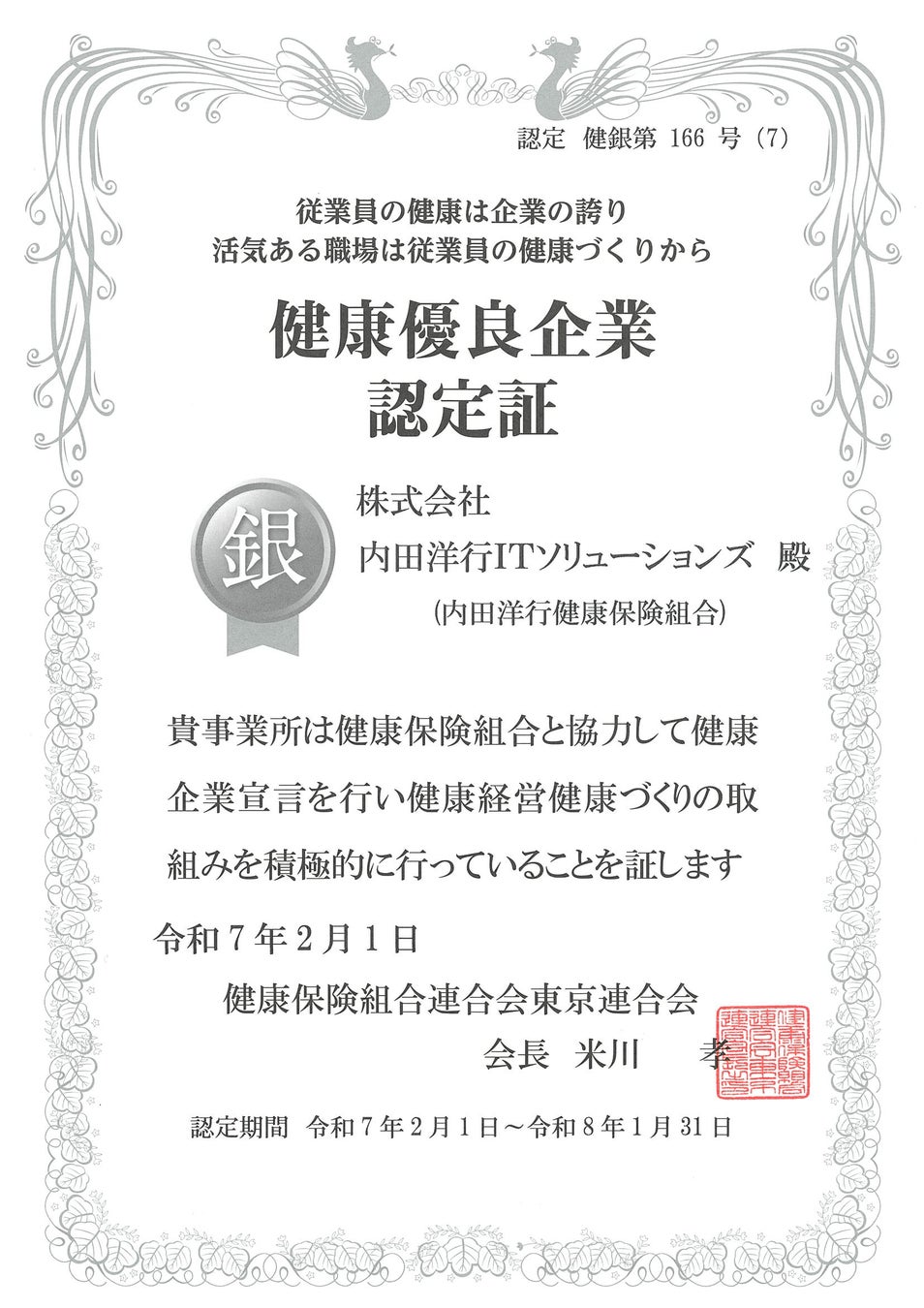 株式会社内田洋行ITソリューションズ(本社:東京都江東区、代表取締役社長:新家 俊英、以下 ITS)は、「健康企業宣言※」を行い、健康経営・健康づくりの積極的な取り組みが評価され、健康優良企業に認定される「銀の認定」を取得しました。