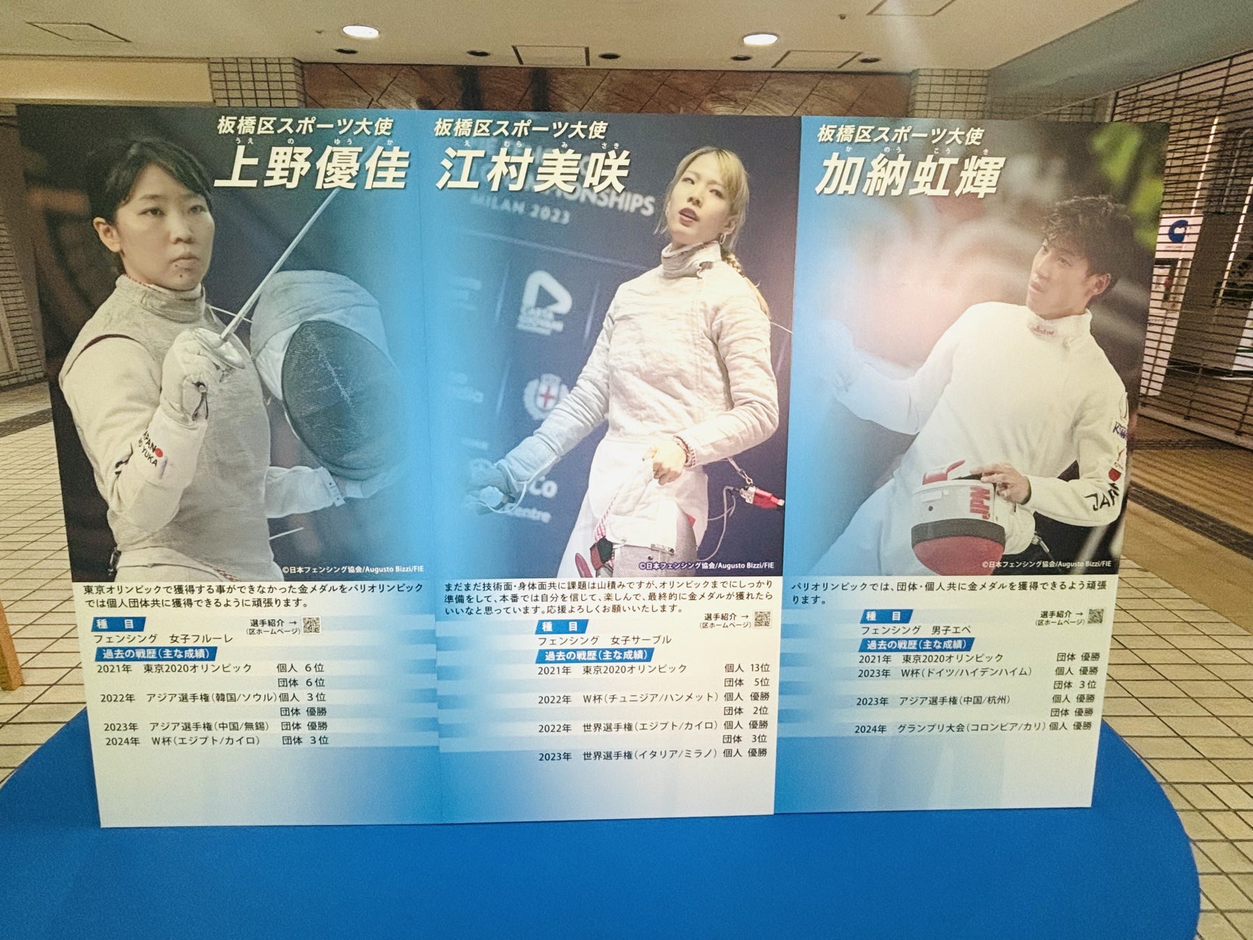 現在10名、1団体が板橋区スポーツ大使に委嘱されており、フェンシング3選手のほか、女子日本レスリングチーム、岩渕幸洋選手(パラ卓球)、木村潤平選手(パラトライアスロン)がパリ2024オリンピック・パラリンピック競技大会に出場予定です。