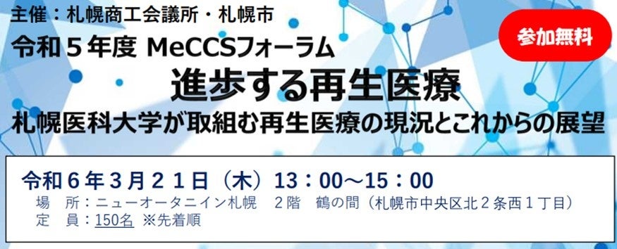 札幌市、札幌商工会議所「MeCCS推進会議」では、札幌が誇る最先端医療を核に様々な産業が連携し、新たな産業集積を図る「Medical Cluster City Sapporo構想」の一環として、札幌医科大学が研究開発した世界初の脊髄損傷再生医療治療薬「ステミラック注」による再生医療の取組の現況と今後の展望についてご講演をいただくフォーラムを下記のとおり開催する運びとなりました。