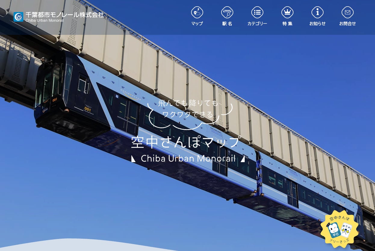 「空中さんぽマップ」では、千葉都市モノレール沿線にある観光・生活スポットを紹介。現在は都市アイデンティティに関わる拠点を中心に掲載しており、今後も順次拡大予定です。公開後の運営・保守管理にあたっては、地域情報サイト「まいぷれ」の運営も行っている株式会社フューチャーリンクネットワーク(本社:千葉県船橋市、代表取締役:石井丈晴)にご対応いただきます。