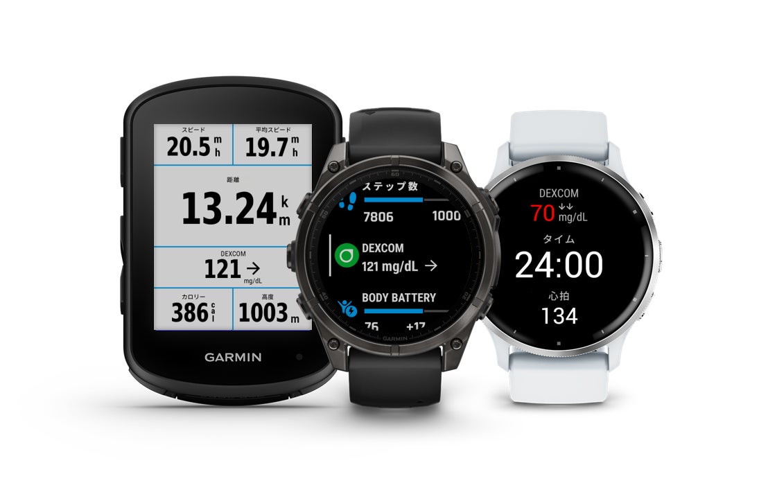 「Dexcom」アプリは、Garminのマルチスポーツに対応したフラッグシップモデルから、豊富なヘルスモニタリング機能を搭載したフィットネスGPSウォッチ、またすべてのランナーをサポートするランニングGPSウォッチまで、さまざまなウェアラブルデバイスに対応しています。さらに、サイクリングコンピューター「Edge」シリーズの一部では、グルコース値をデータフィールドに表示することが可能です。
