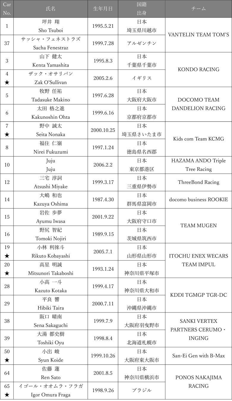 2025 SUPER FORMULA Rd.3-4 エントリーリスト