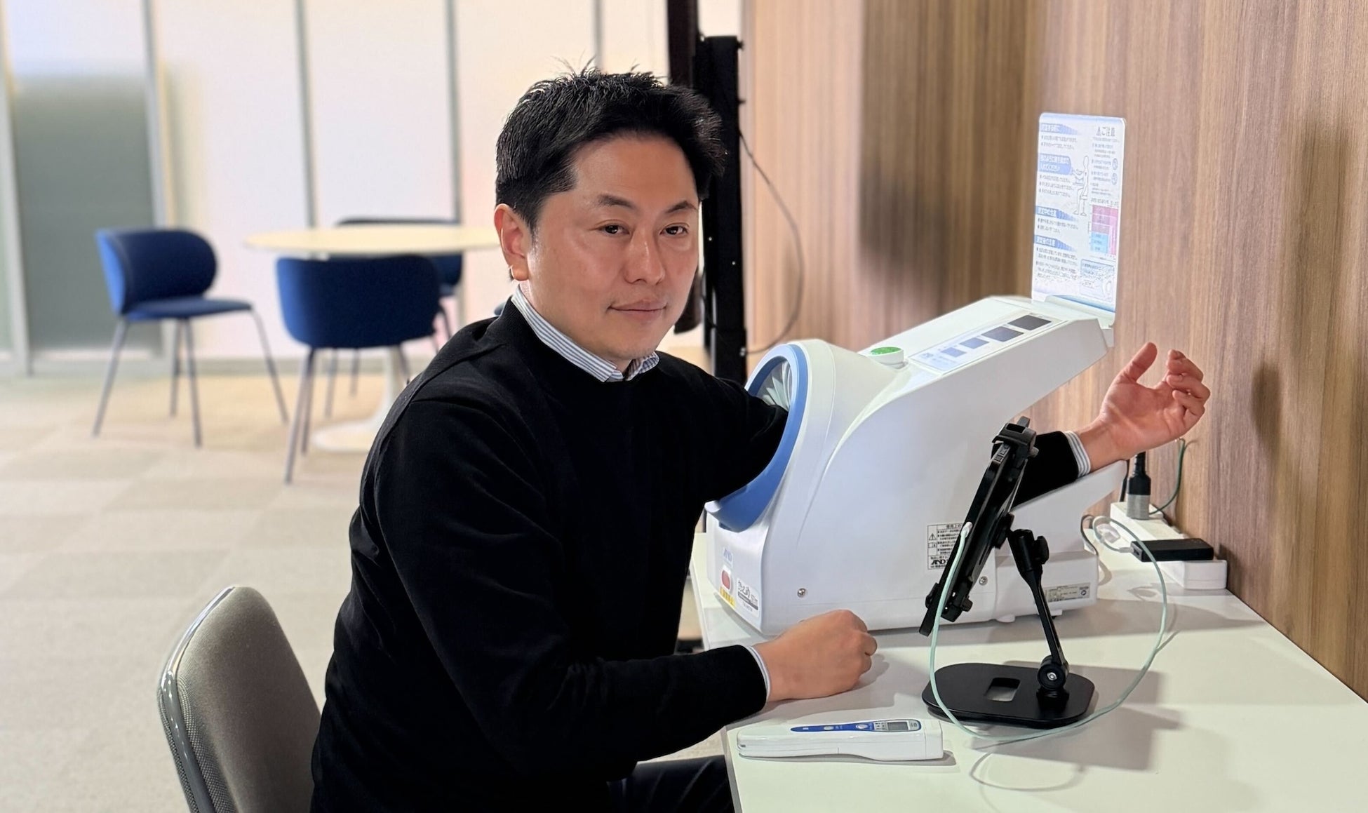 1. バイタル測定と顔認証の連携 営業所に出勤後、「newmoバイタル」タブレットにて顔認証による本人確認を行ったうえで、体温と血圧を測定します。測定結果は即座にシステムへ自動保存されます。