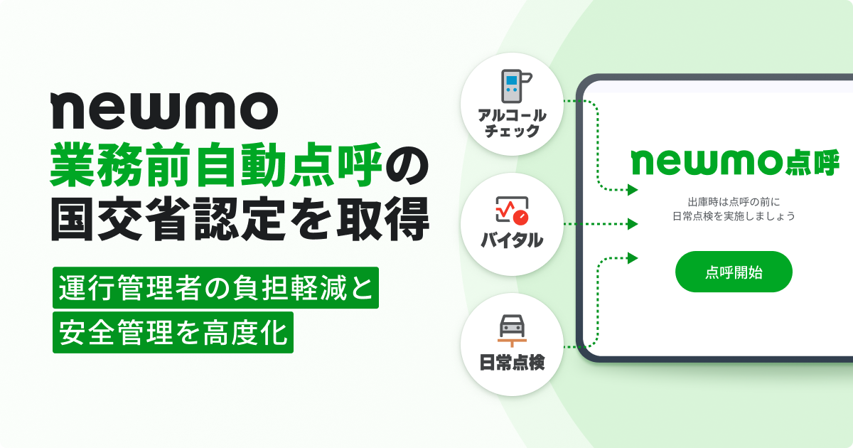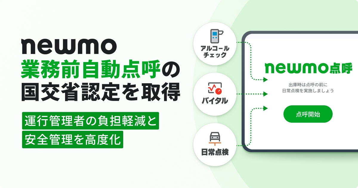 タクシー事業を展開するnewmo株式会社(本社:東京都港区、代表取締役:青柳直樹、以下「newmo」)は、自社開発の点呼機器「newmo点呼」において、新たに「業務前自動点呼」の国土交通省認定を取得(JM26-016)したことをお知らせします。 これにより、以前より認定を受けていた「業務後自動点呼」に加え、始業時の点呼においても、一定の条件下で運行管理者の対面確認を必要としない完全自動化が可能となります。本システムは、2026年2月よりnewmoグループの夢洲交通および未来都にて運用を開始いたします。