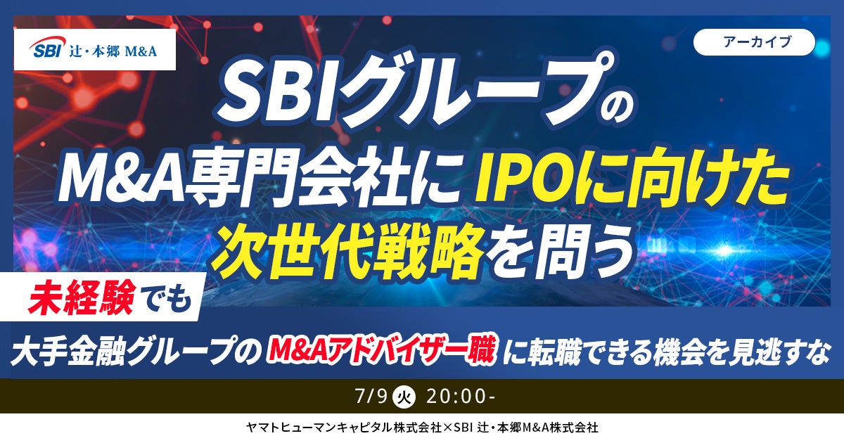 ヤマトヒューマンキャピタル株式会社(本社:東京都千代田区、代表取締役:堀江 大介)は、2024年7月9日(火) 20:00よりオンラインにて、ウェビナー『SBIグループのM&A専門会社に、IPOに向けた次世代戦略を問う』を開催いたします。