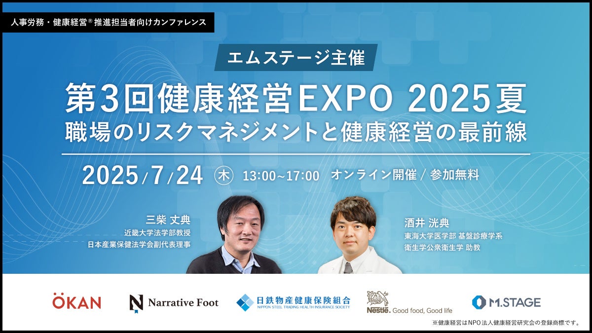 株式会社エムステージ(本社:東京都品川区、代表取締役:杉田雄二)産業保健事業部は、7月24日(木) 13時より、2025年度の健康経営の推進を語る『第3回 健康経営EXPO 2025夏』をオンラインにて開催いたします。