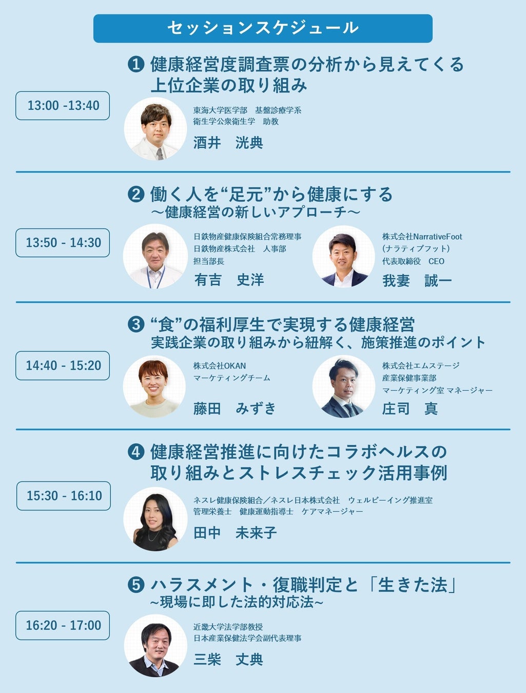 忖度や建前の無い語り口で知られる近畿大学法学部教授の三柴 丈典氏による過去の判例を交えた、もしもの時に企業に求められる適切な対応方法や、東海大学医学部助教の酒井 洸典氏による健康経営度調査票の自由記述データを用いた研究結果から読み取る企業の傾向、従業員の健康を支える具体的なソリューションなど、明日から活かせる実践的な情報をお届けします。