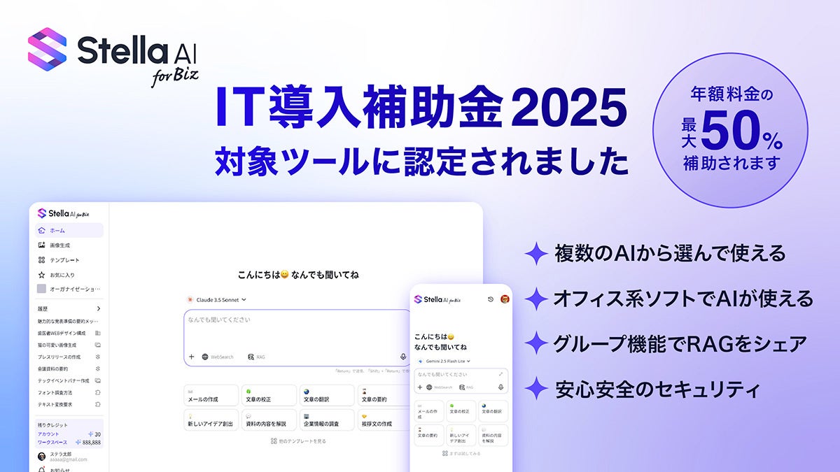 生成AIサービス「Stella AI for Biz」が「IT導入補助金2025」の対象ITツールに認定