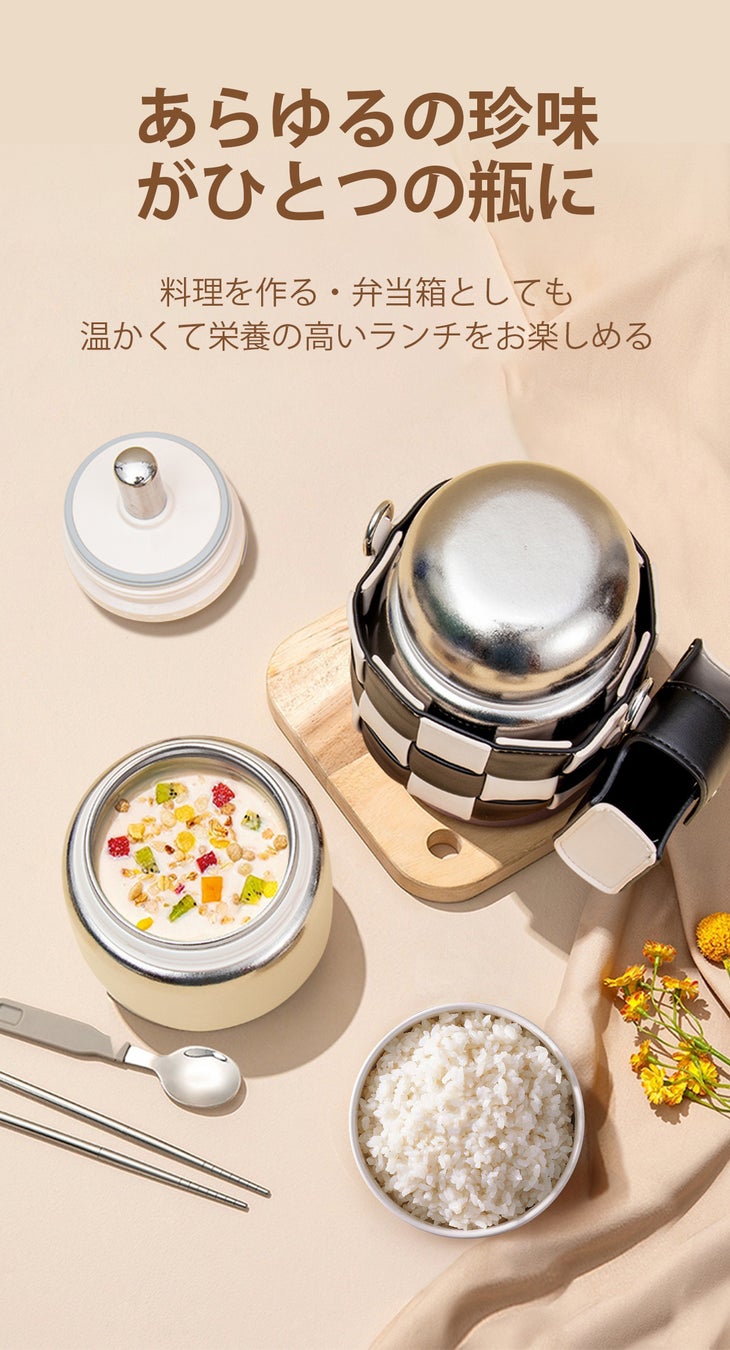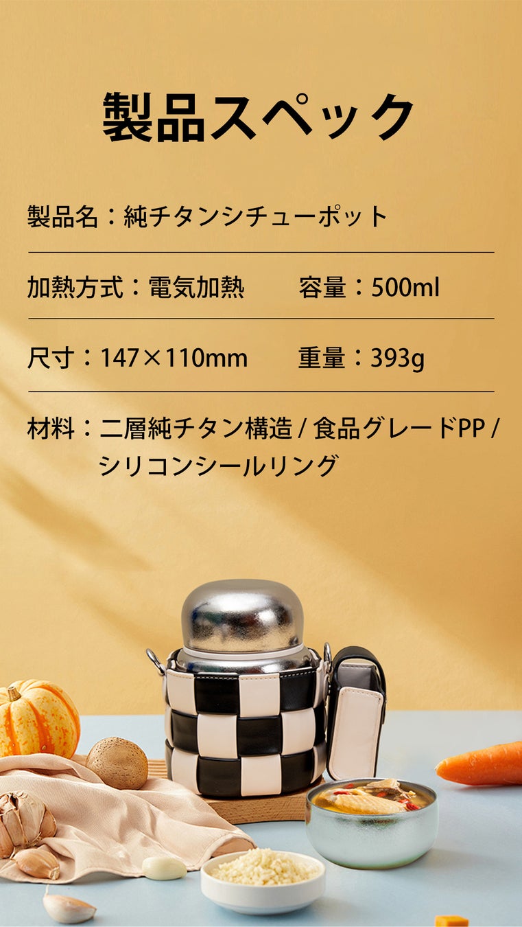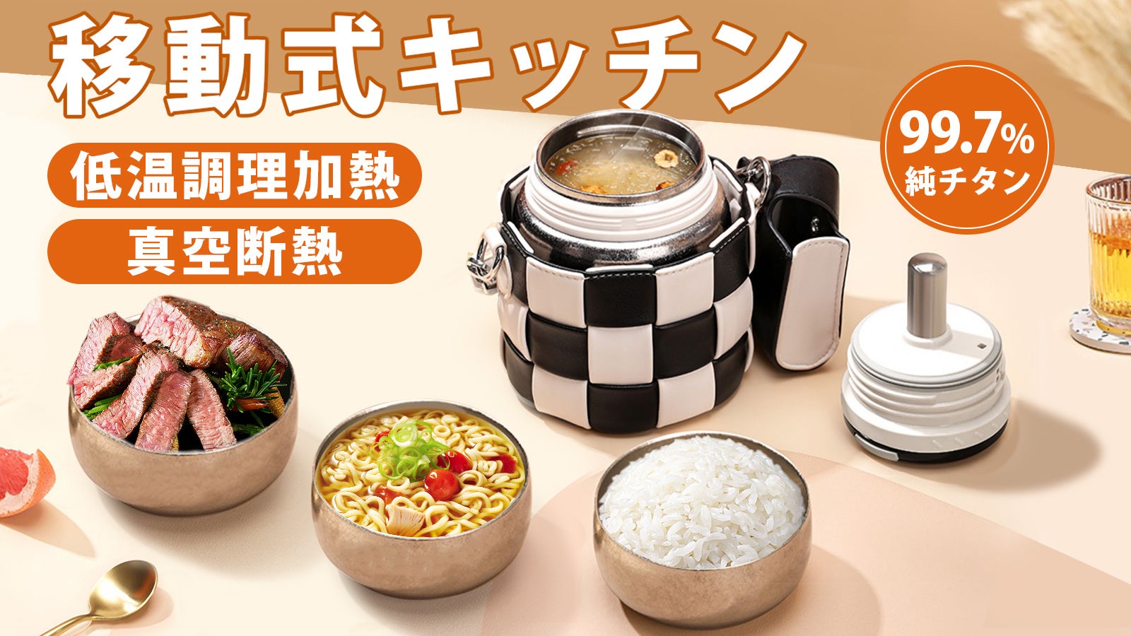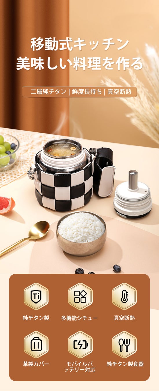 純チタン製生体親和性金属、酸とアルカリに強い耐性、抗菌性と鮮度保持の効果抜群!モバイルバッテリー加熱対応、美味しさを最大限に引き出し!真空断熱調理、電源なくても熱湯からアウトドアも新鮮な食物を味わい