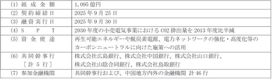本件は、中国電力の事業基盤である中国地方の金融機関を共同幹事行とし、中国地方内外の複数金融機関が協調してファイナンス面でサポートするシンジケーション方式としています。
