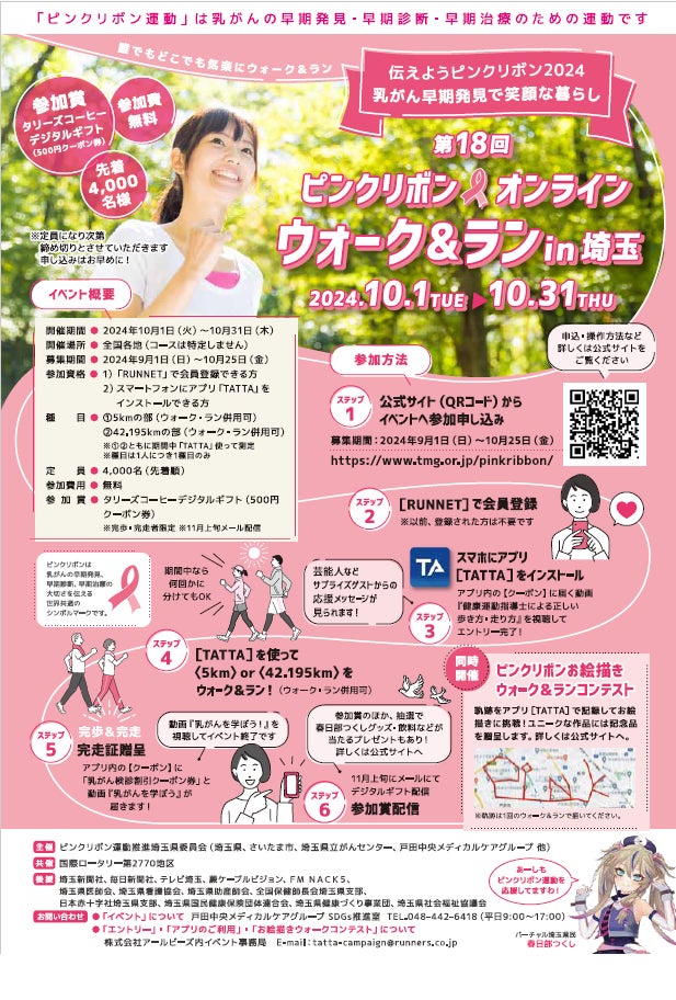 また、昨年に続き5キロメートル又は42.195キロメートルをウォーク&ラン する「ピンクリボンオンラインウォーク&ランin埼玉」を開催します。参加費用は無料です。先着4,000名の完歩・完走者限定でタリーズコーヒーデジタルギフト(500円クーポン券)が配信されます。定員になり次第締め切りとさせていただきますので、お早めにお申し込みください。さらに、ウォーキング又はランニングした軌跡をアプリで記録して応募する、「ピンクリボンお絵描きウォーク&ランコンテスト」も同時開催します。せひご参加ください。