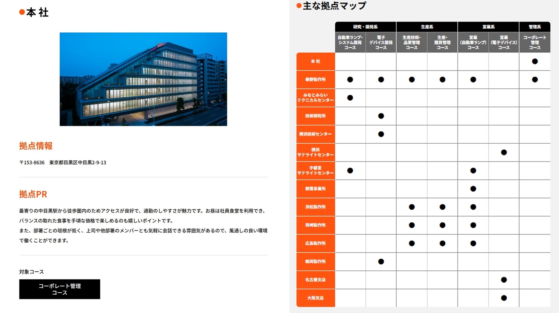 各拠点の情報を充実させるとともに、「コース×拠点マップ」を新設しました。各コースの主な活躍拠点を一目で確認でき、働く場所を具体的にイメージしやすい内容となっています。