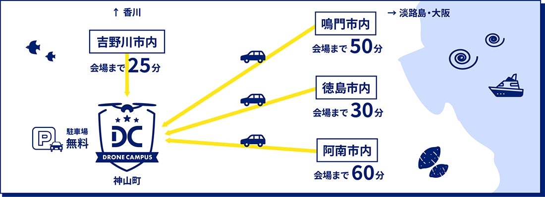 「ドローンキャンパス 徳島の空」は、神山町の「広野小学校 旧屋内運動場」を講習会場として活用します 。 本スクールは、徳島市内から車で約30分、鳴門市内から約50分、阿南市内から約60分、吉野川市内から約25分という立地にあります。広域からの受講生を受け入れやすい環境を整え、「1泊2日」の短期集中合宿で効率的な資格取得をバックアップします 。