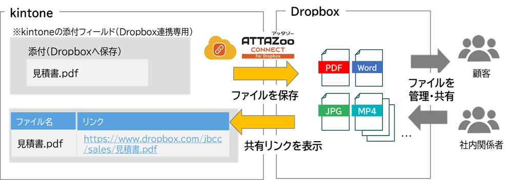 「ATTAZoo Connect for Dropbox」は、kintoneとDropboxを連携し、kintoneアプリに添付されたファイルを自動でDropboxへ保存・管理します。保存されたファイルの共有リンクがkintoneのレコード上に自動で表示され、それをクリックするだけでファイルにアクセスすることができます。この連携により、例えば営業活動の進捗に応じてkintoneアプリに見積書を添付し、それをDropbox経由で顧客やバックオフィス部門と共有するといった、シームレスな業務連携が可能になります。