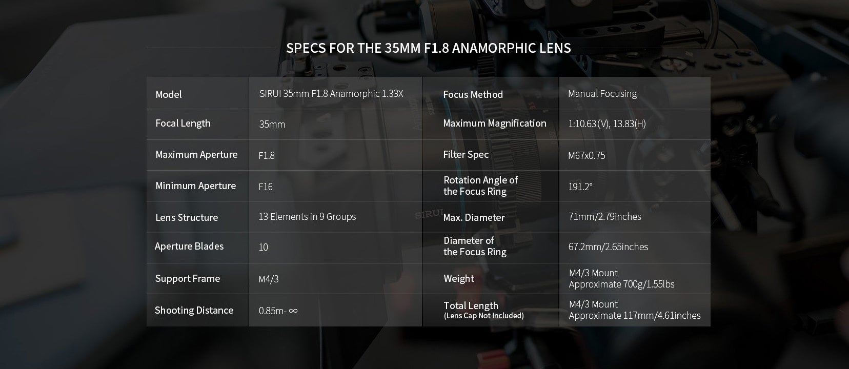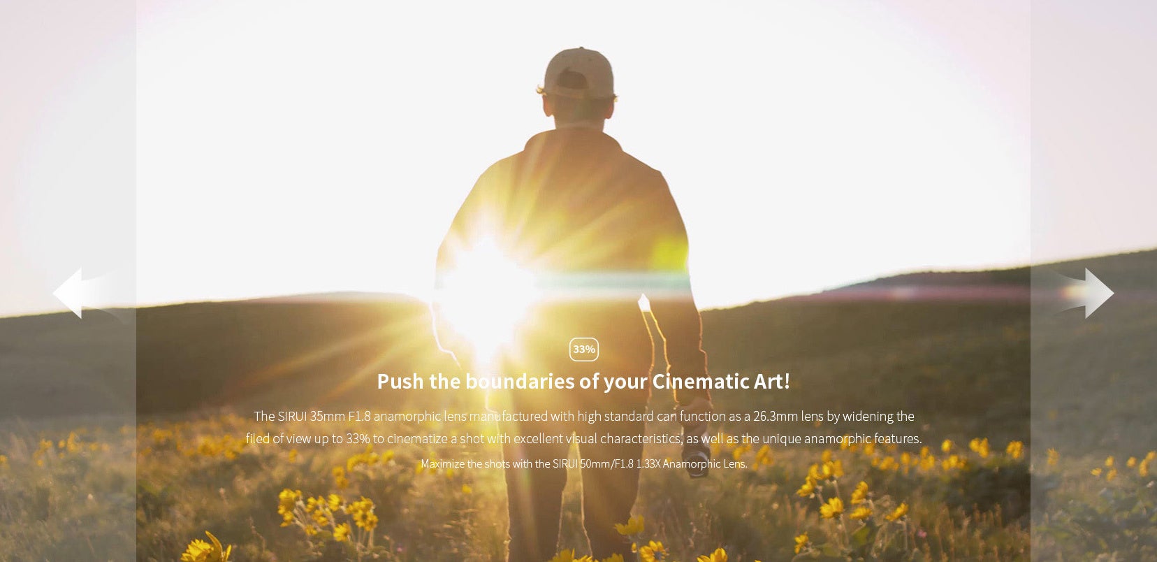 SIRUI 35mm F1.8 アナモルフィックレンズは、高い基準で製造され、視野を33%拡大することで26.3mmレンズとして機能します。これにより、優れた視覚特性とユニークな特徴を持つショットをキャプチャできます。さらに、SIRUI 50mm F1.8 1.33x アナモルフィックレンズでショットを最大限に引き出しましょう。