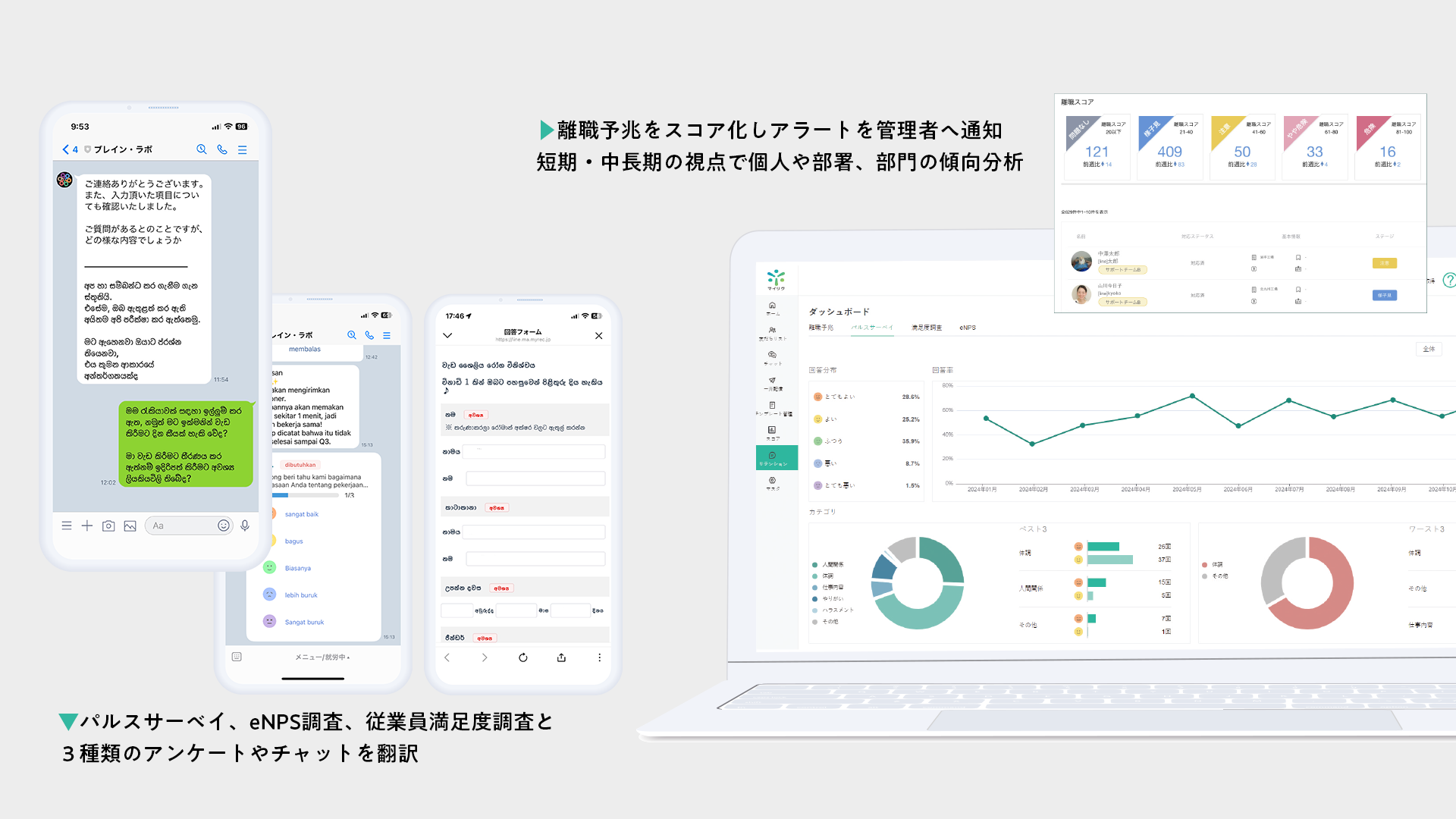 「マイリク」は、従業員やスタッフにアンケートやメッセージを配信できるLINE公式アカウント拡張ツールです。パルスサーベイ、eNPS調査、従業員満足度調査といった三種類のアンケートを外国語で配信し、従業員一人ひとりのモチベーションや体調、コンディションを継続的に把握することができます。アンケートの回答結果は、短期および中長期の視点で個人や部署、部門単位の傾向分析ができ、離職につながる兆しをスコアとして可視化できます。スコアが一定の基準を超えた場合に管理者にアラート通知し、問題が大きくなる前に適切なフォローを行うことが可能です。言語の壁によって見逃されがちだった小さな変化や不調のサインを、データとして把握できる点が「マイリク」の大きな特長です。