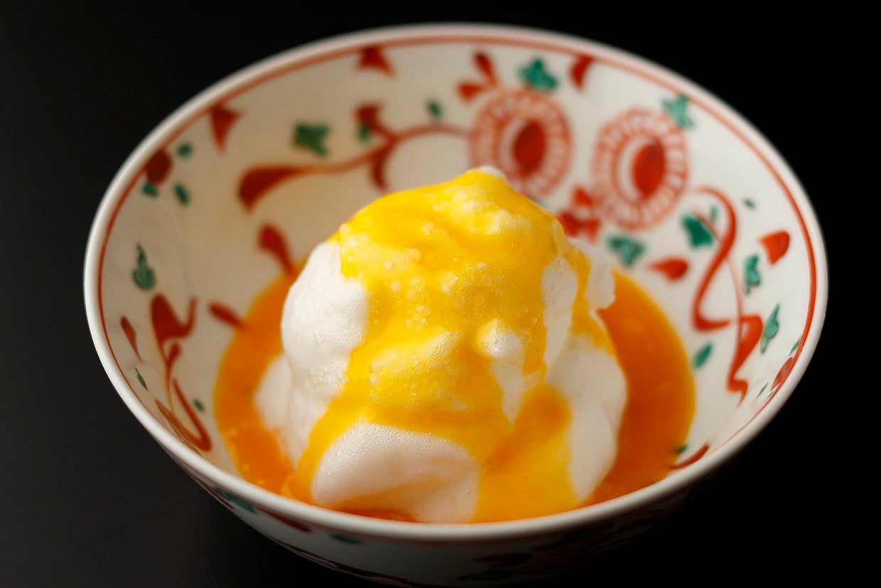 すき焼きは、秘伝の割り下とトリュフ風味の自家製ふわふわ泡玉子をお肉にからませお召し上がりいただくとともに、お食事はなだ万最高峰のかつお出汁で味わうすき焼き茶漬けをご用意しています。