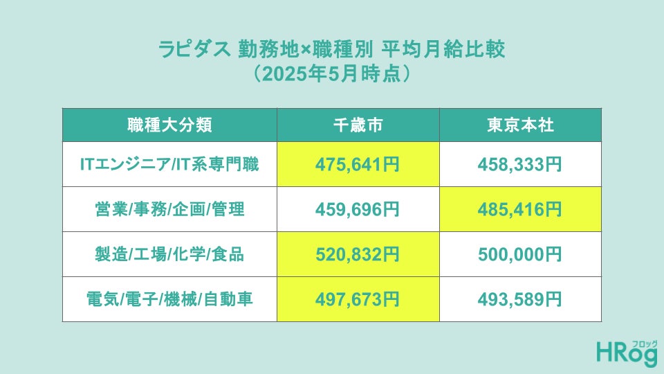 続いて、2025年5月時点におけるラピダスの平均月給を勤務地別および職種別の分析で見てみると、営業・事務以外では東京本社より千歳市の方が高いことが分かりました。