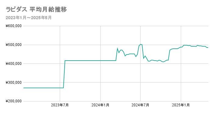2023年1月から現在までの平均月給推移を見てみると、271,000円からスタートした平均月給は、2025年5月時点で485,720円まで上昇しています。2023年7月下旬には、同じ仕事内容で出稿された2件の求人において月給が271,000円から416,000円に変更されたため、全体の平均月給も上昇しました。現在では、管理職クラスの募集で80万円を超える求人もあり、給与水準の高さがうかがえます。