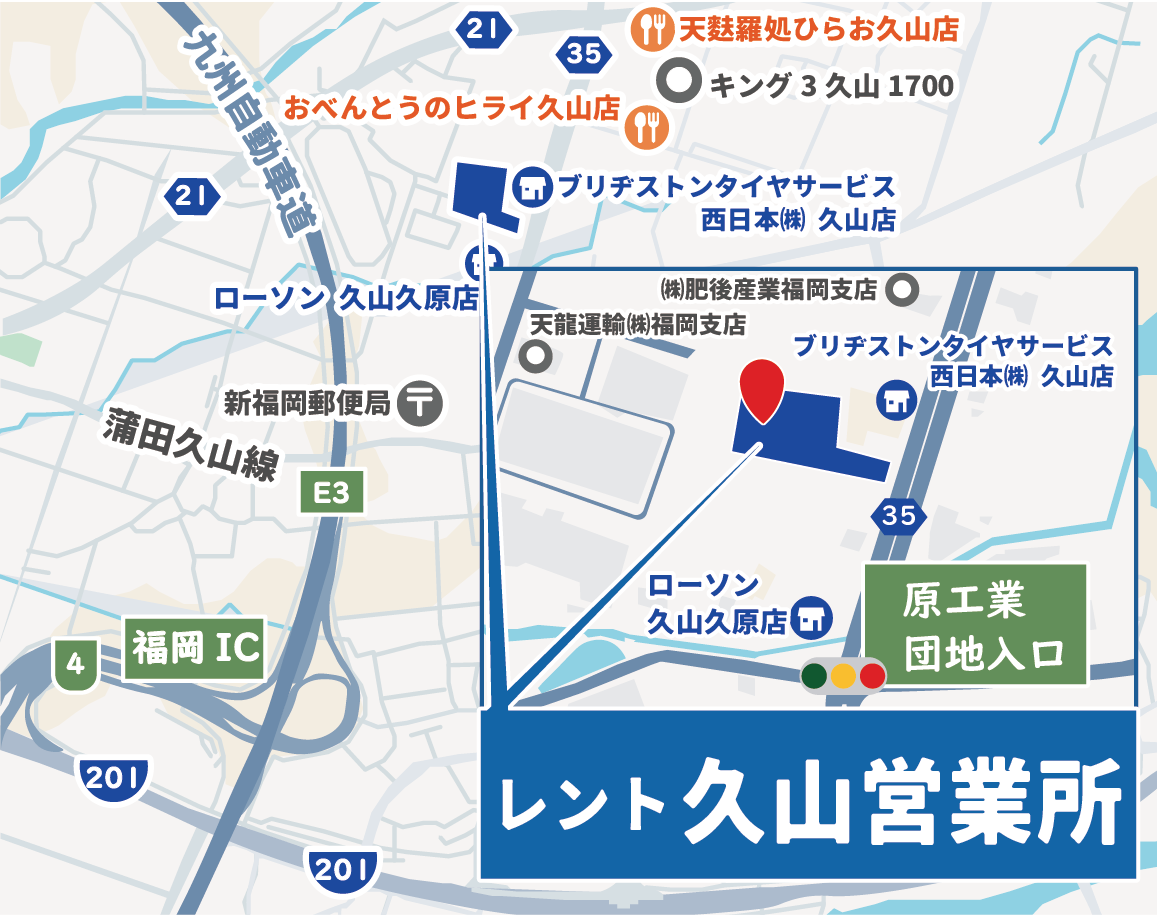 久山出張所は、福岡ICから5分の好立地にあり、特にレンタル車両のご利用については、事前のご予約によって24時間貸出・返却が行えるサービス、Smart RENTの併設を予定しておりますため、より便利にご利用いただけます。
