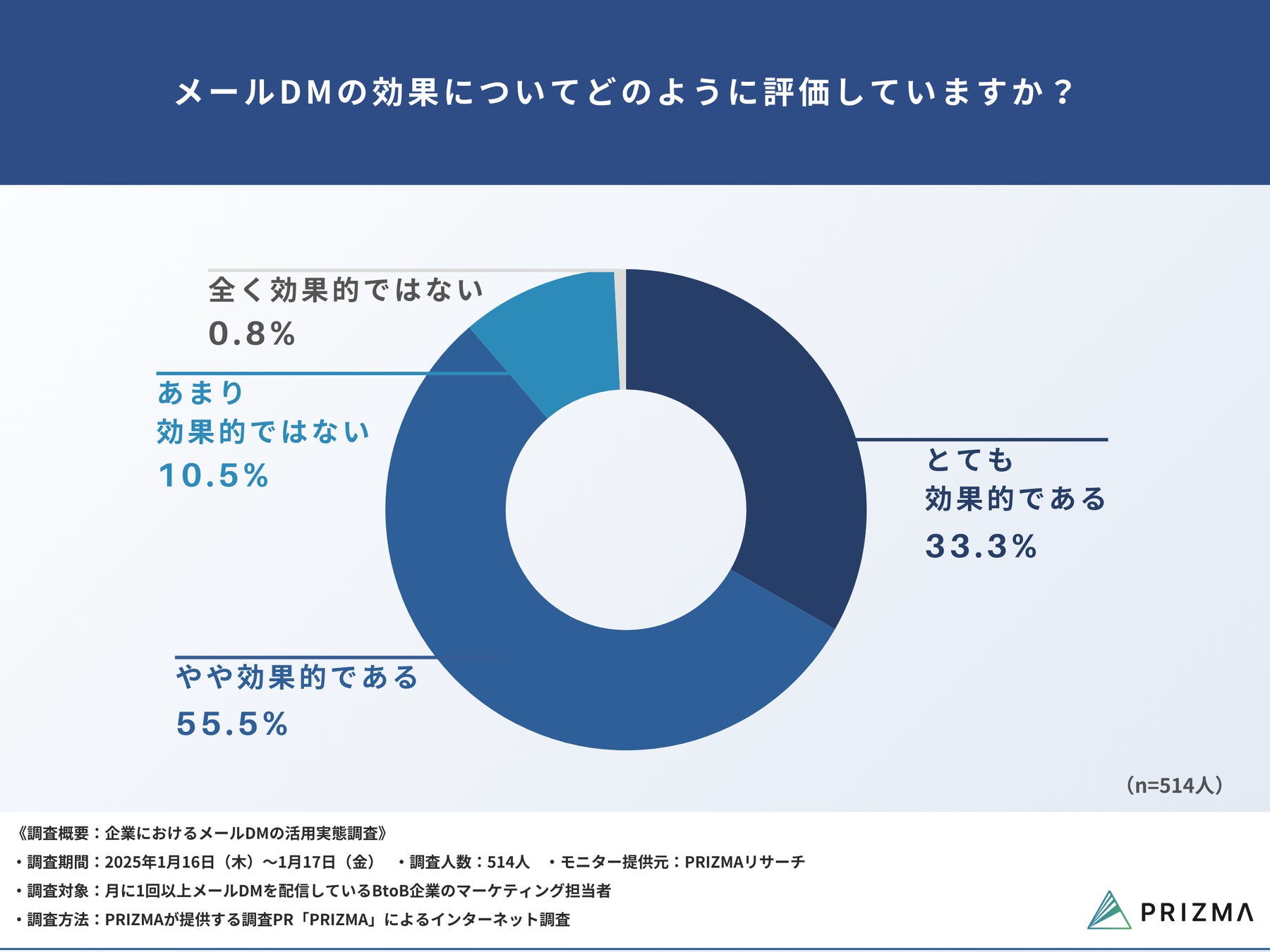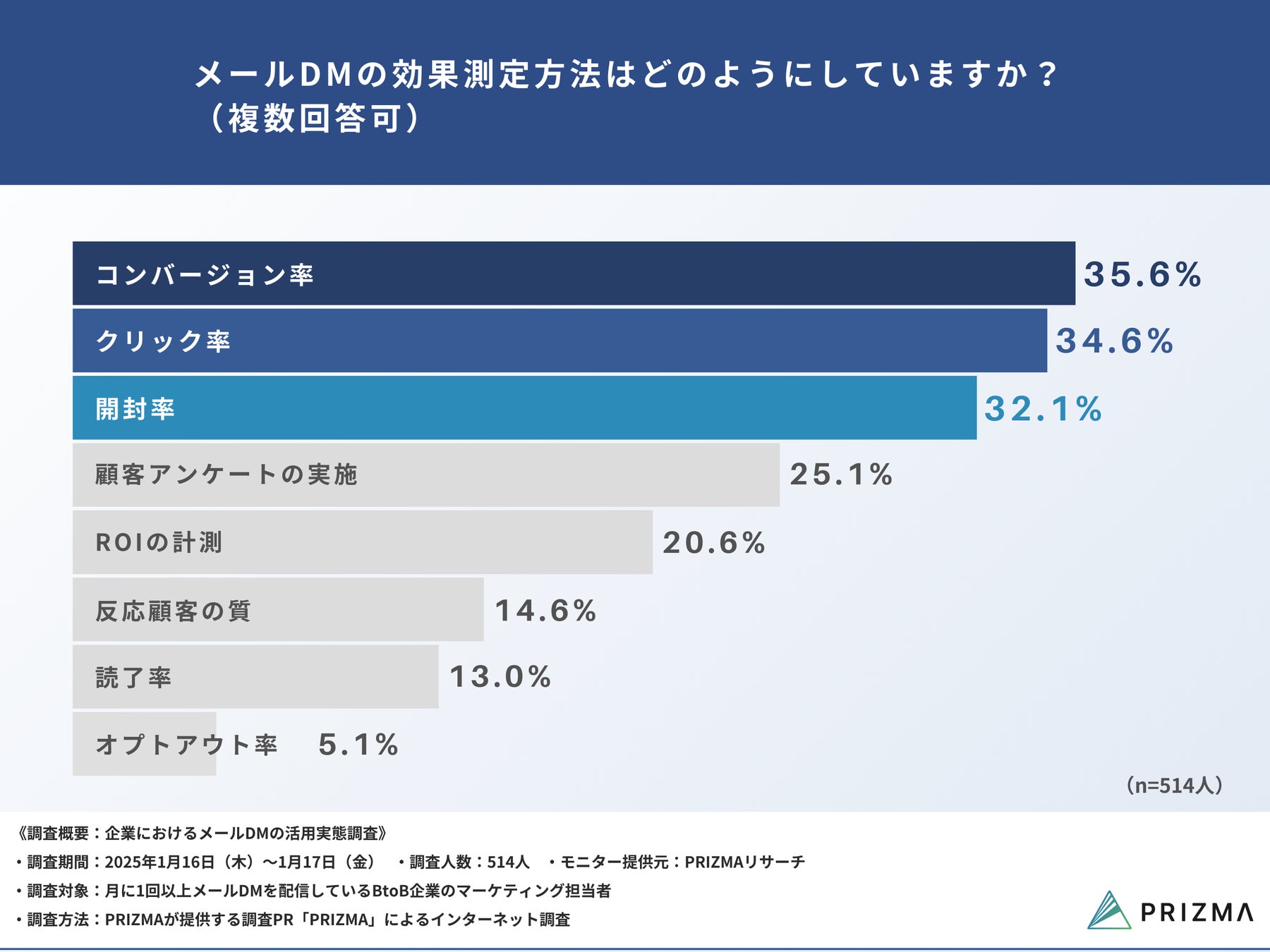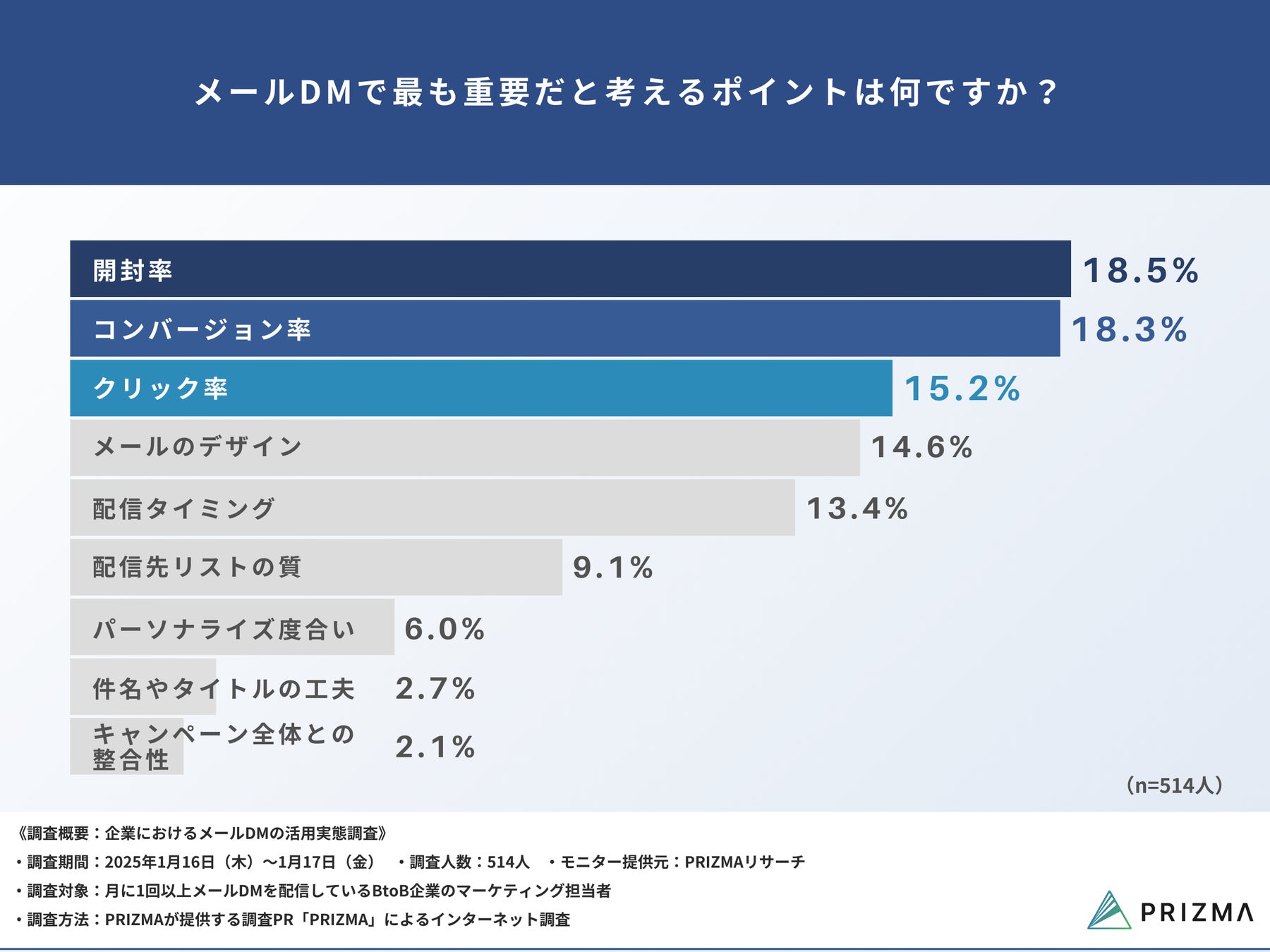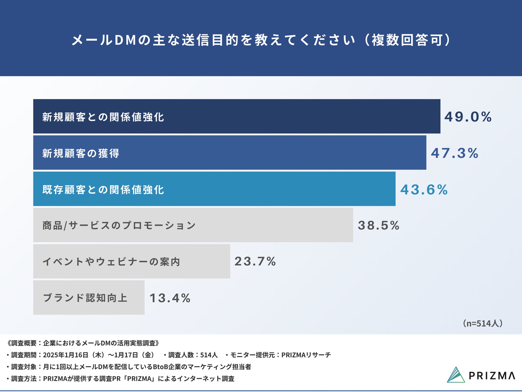 今回、株式会社PRIZMA(https://www.prizma-link.com/press)は、月に1回以上メールDMを配信しているBtoB企業のマーケティング担当者514名を対象に、「企業におけるメールDMの活用実態調査」を実施しました。