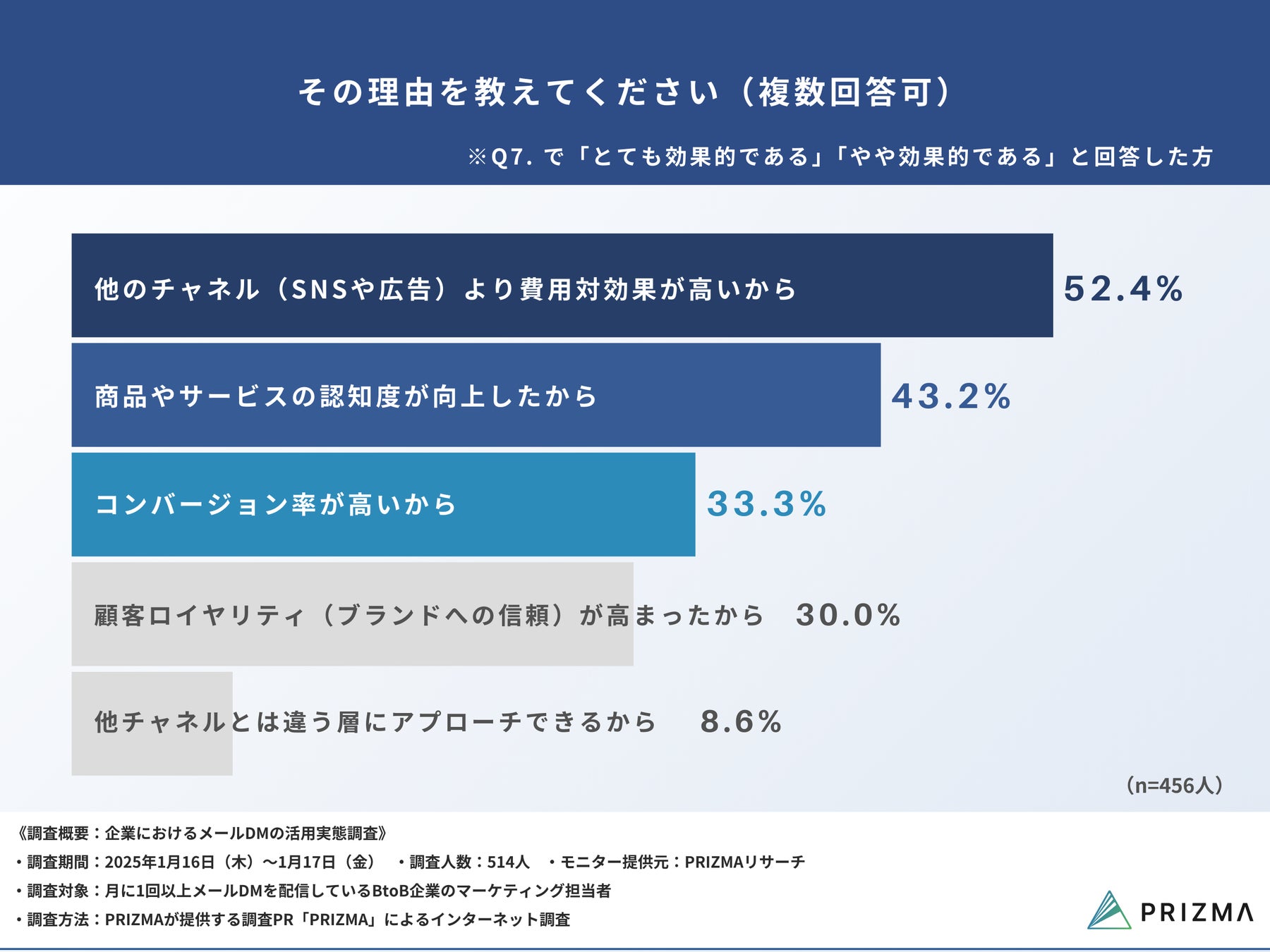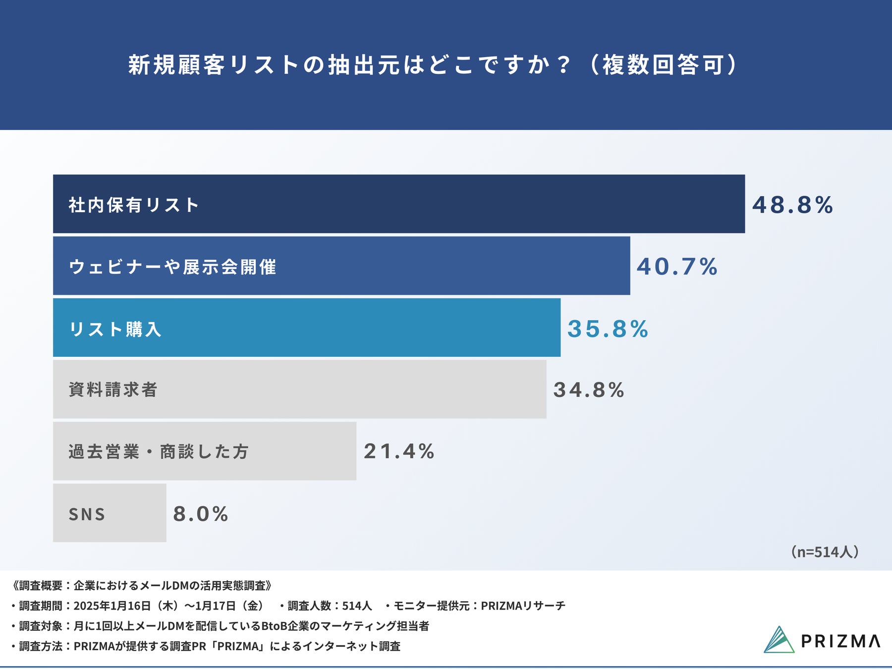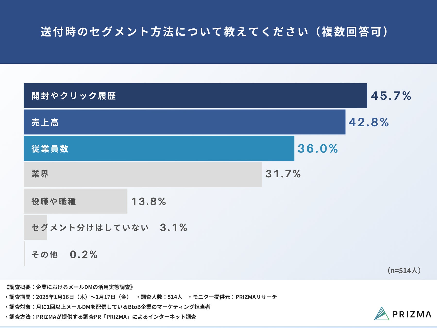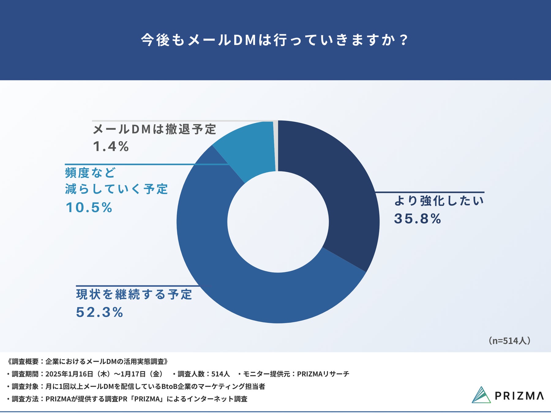 今回、株式会社PRIZMA(https://www.prizma-link.com/press)は、月に1回以上メールDMを配信しているBtoB企業のマーケティング担当者514名を対象に、「企業におけるメールDMの活用実態調査」を実施しました。
