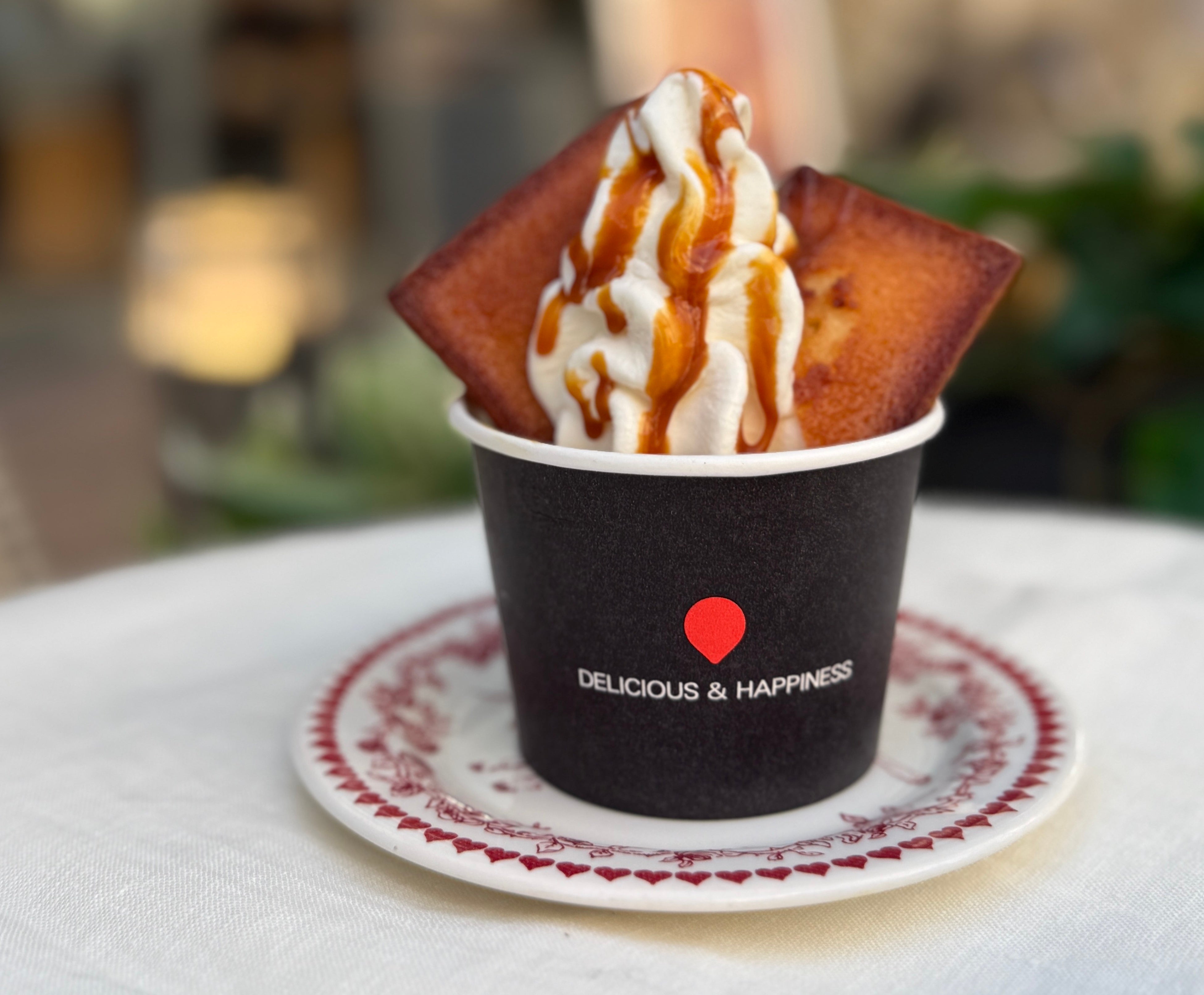 ヴァニラソフトクリームに、自家製キャラメルとフランス産発酵バターで焼き上げた自家製フィナンシェを合わせた一品です。香ばしさとコク、なめらかな口どけが重なり合う、贅沢な味わいをお楽しみいただけます。