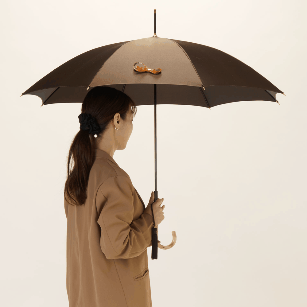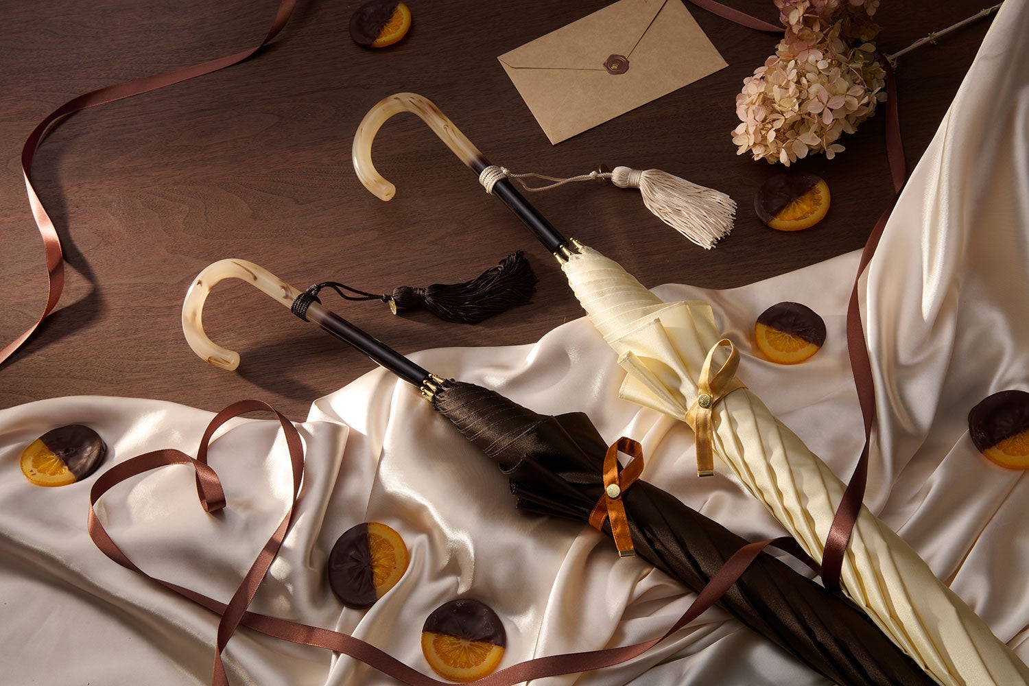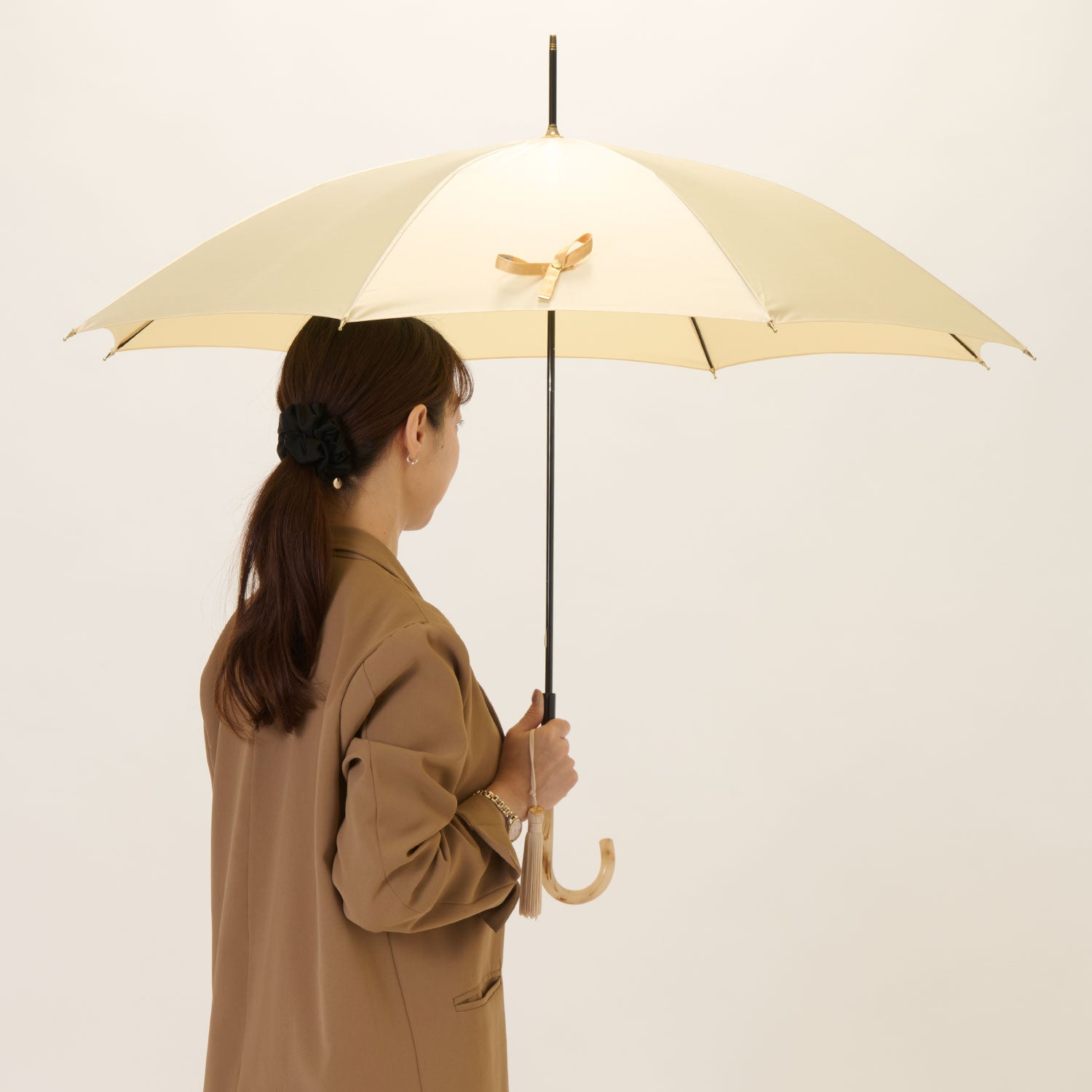 滑らかな光沢を放つサテン生地は、傘生地生産が盛んな山梨県富士吉田市にある、老舗傘生地メーカーで織られました。光をやわらかく反射し、傘を閉じたときに綺麗に生地が垂れるドレープでとろける質感を表現しています。また、熟練の職人による丁寧な仕立ては無駄なしわやたるみを極力抑え、傘を閉じたときも開いた時も美しいシルエットが魅力です。