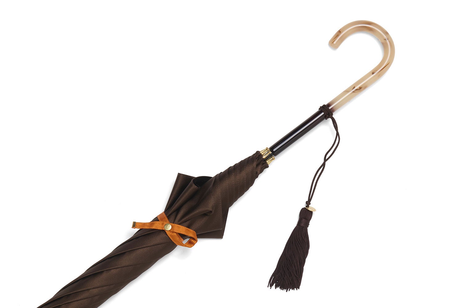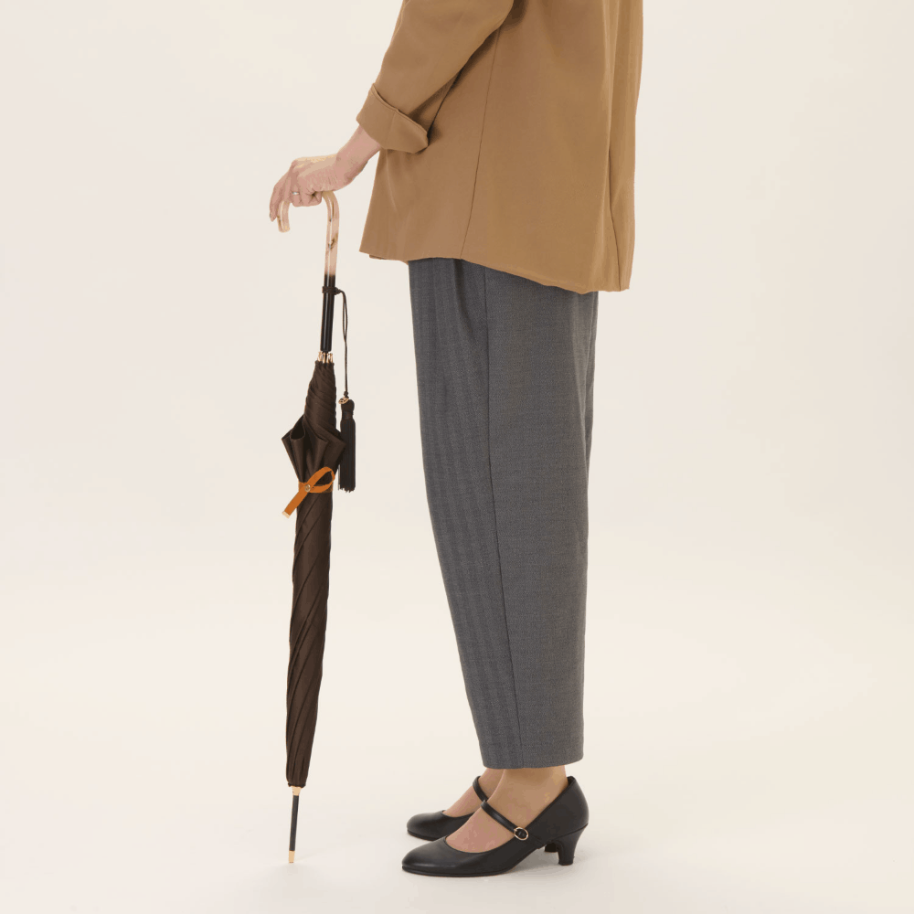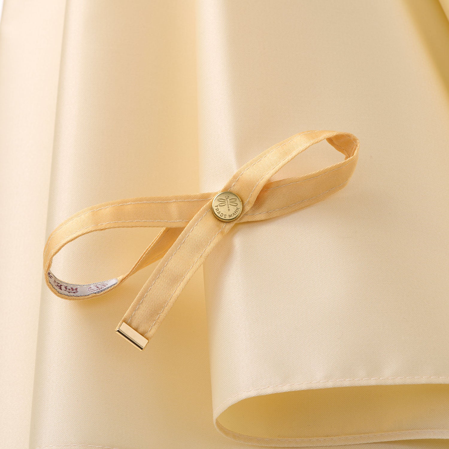 滑らかな光沢を放つサテン生地は、傘生地生産が盛んな山梨県富士吉田市にある、老舗傘生地メーカーで織られました。光をやわらかく反射し、傘を閉じたときに綺麗に生地が垂れるドレープでとろける質感を表現しています。また、熟練の職人による丁寧な仕立ては無駄なしわやたるみを極力抑え、傘を閉じたときも開いた時も美しいシルエットが魅力です。