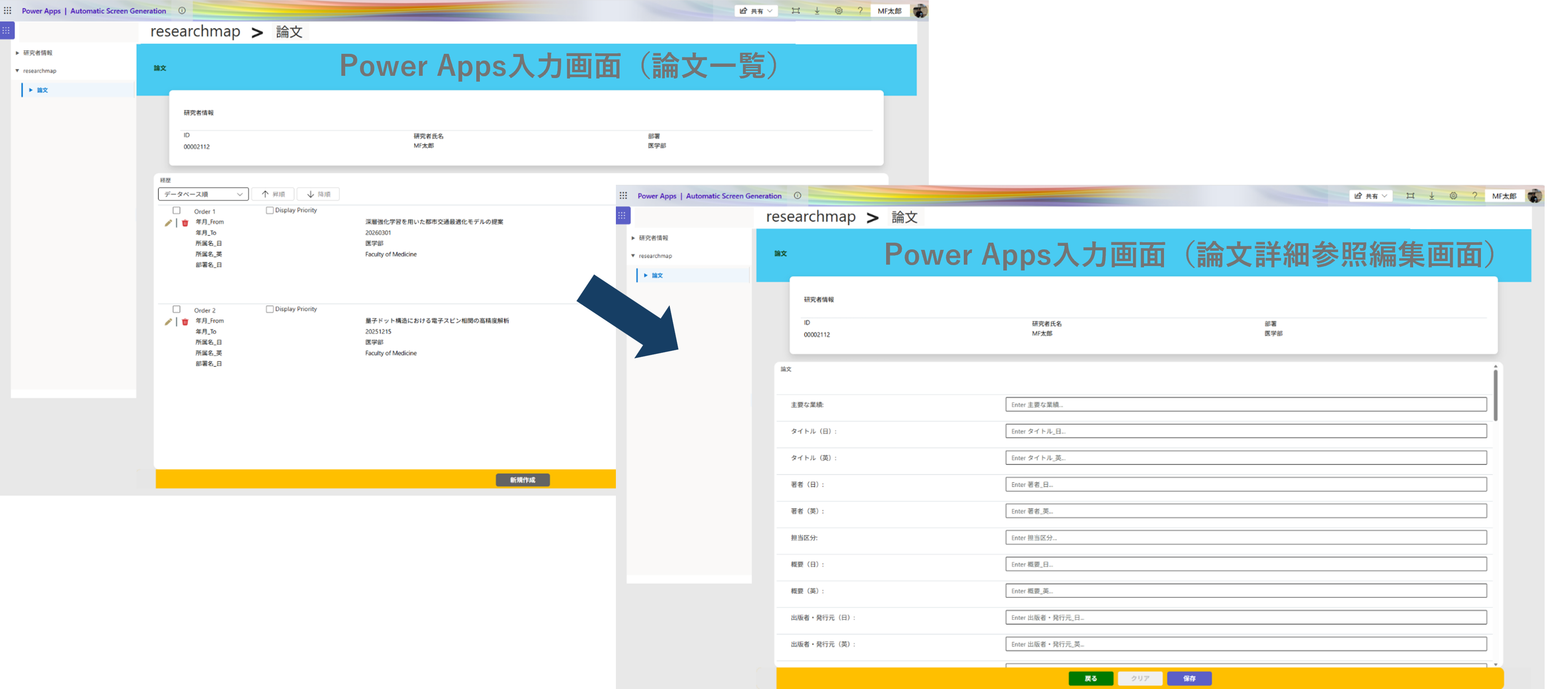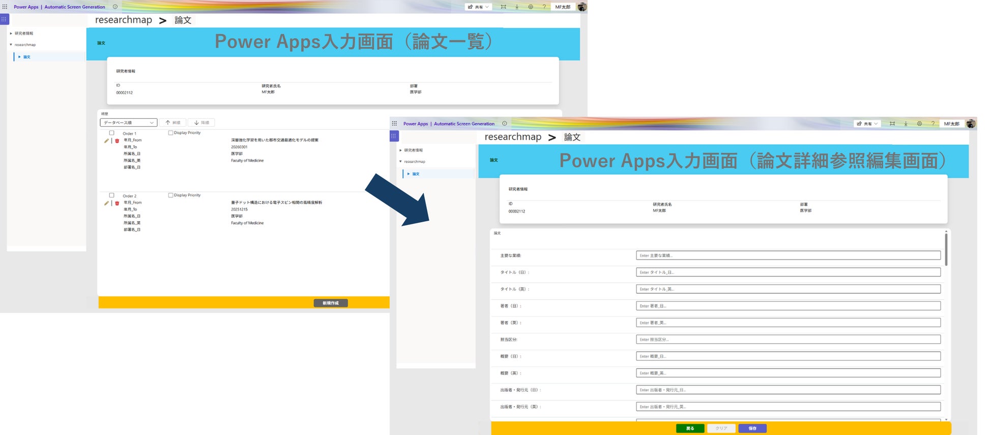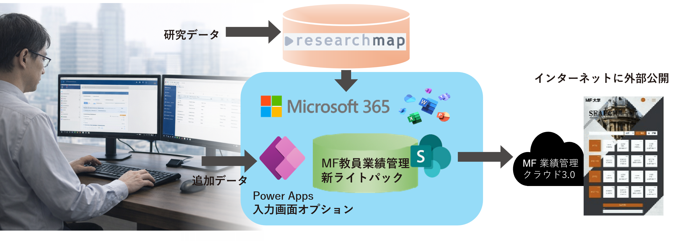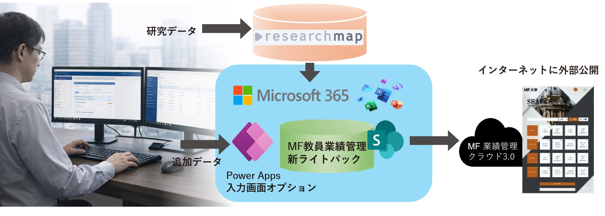 株式会社メディアフュージョン(本社:大阪市北区)は、2025年に大規模ユーザの大学や研究所に対応したMF教員業績管理システム「新ライトパック」をリリースしました。2026年4月1日、本システムの追加オプションとして、researchmapに登録できないデータをPower Appsの追加入力画面で登録できる「Power Apps入力画面オプション」を提供開始しました。