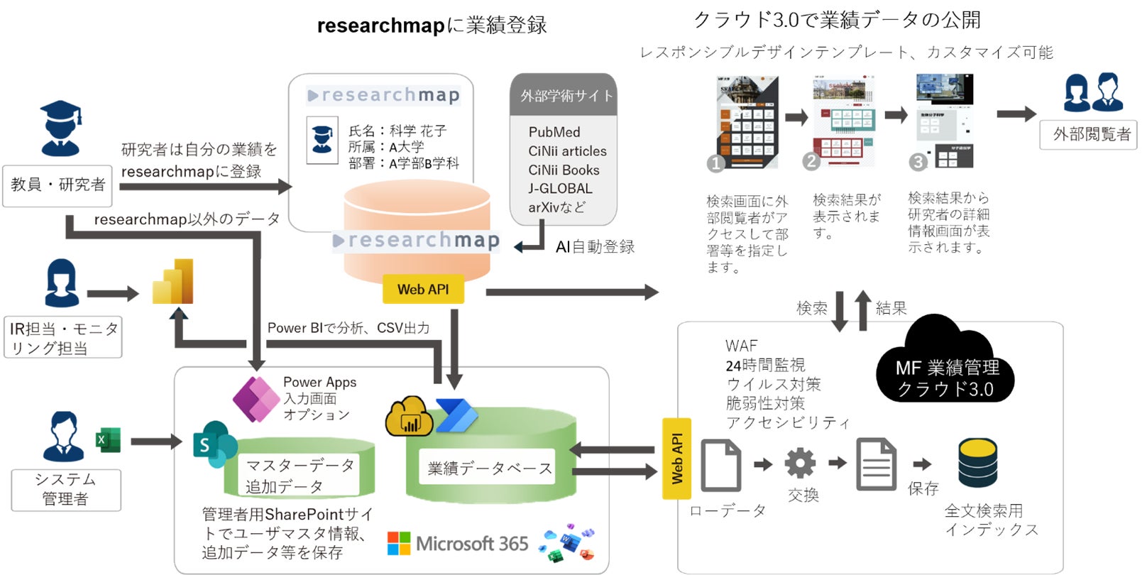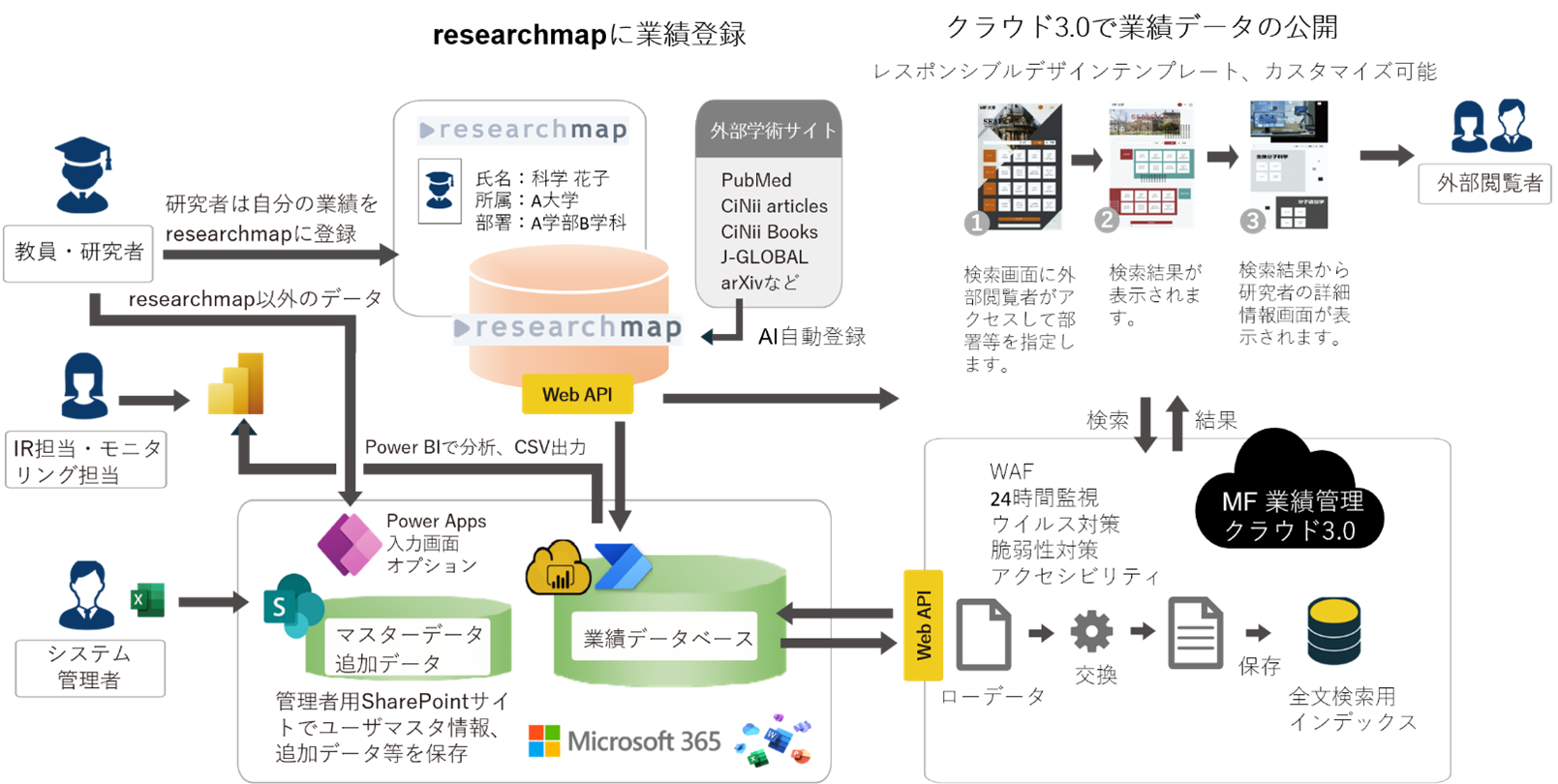 ハイブリッド構成による安全な外部公開:登録した業績の外部公開機能に関しては、Microsoft 365上で実現しようとすると運用費が非常に高額になるため、これは弊社の外部公開クラウドサービス「クラウド3.0」を利用します。