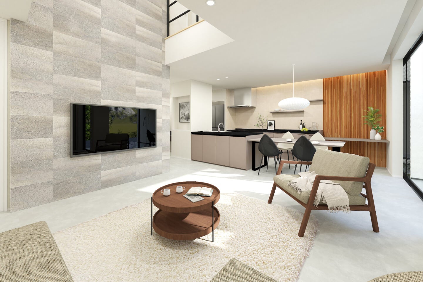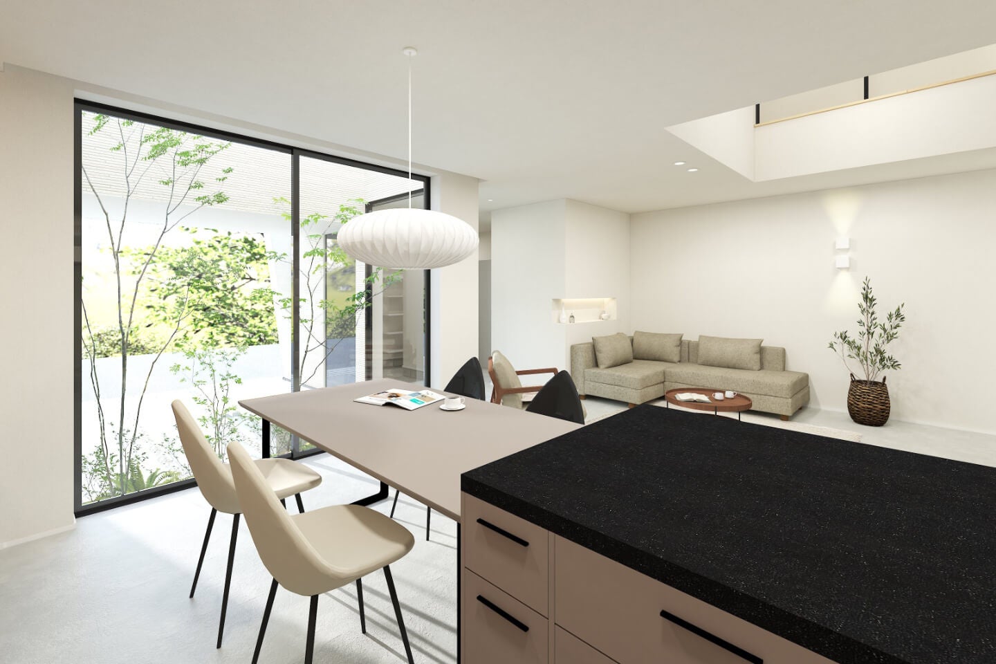 都市部を想定した「コンパクト」な設計でありながら、プライバシーを守る中庭から柔らかな光を招き、ダイナミックな吹き抜けで上下の空間を繋ぐことで、実際の面積を超えた開放感を実現。