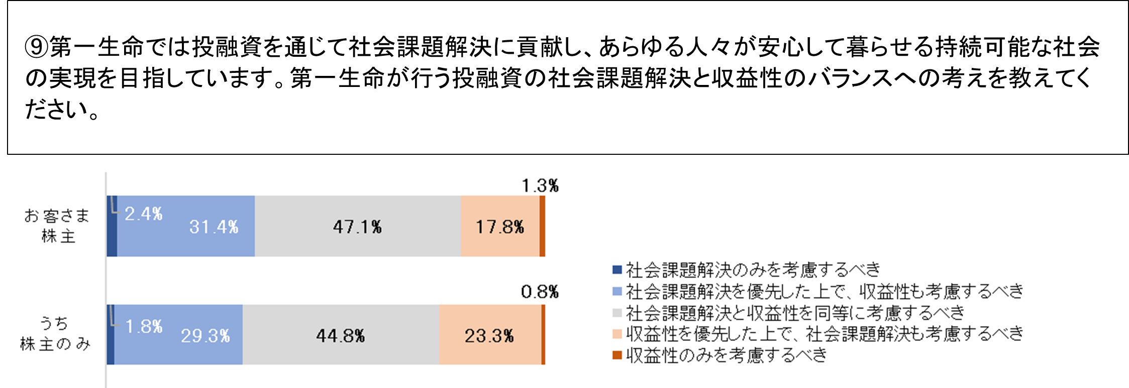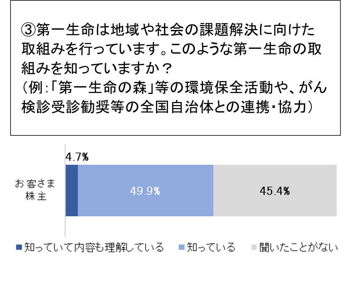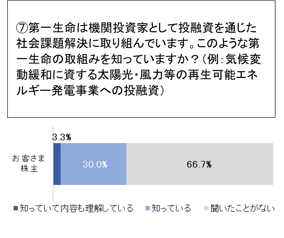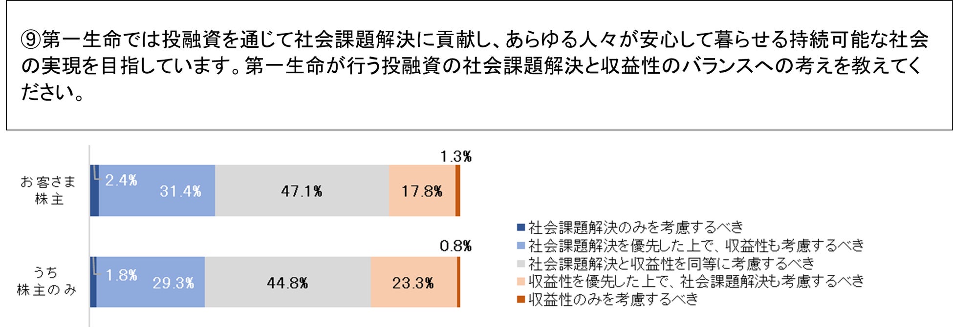 第一生命ホールディングス株式会社(代表取締役社長 グループCEO:菊田 徹也、以下「当社」)は、第一生命保険株式会社(以下「第一生命保険」)と協働で実施したサステナビリティに関するアンケート調査の結果をお知らせします。本調査は、第一生命保険を中心とした当社グループのお客さま、株主の皆さま、ならびに当社グループ各社社員(※1)を対象として実施し、合計60,091名にご回答いただきました。