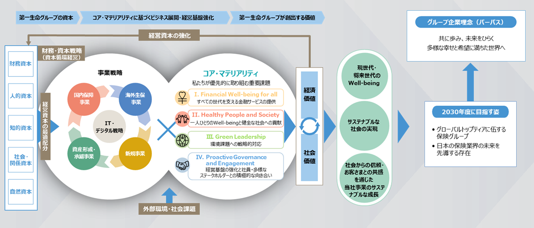 当社グループは、社会における存在意義を表すグループパーパス「共に歩み、未来をひらく 多様な幸せと希望に満ちた世界へ」のもと、社会とともに歩み、未来をひらく存在でありたいと考えています。パーパスの実現の根幹にあるのは持続可能な社会であると考え、当社グループが重点的に取り組むべき社会課題として、4つの「コア・マテリアリティ(※2)」を定義しています。