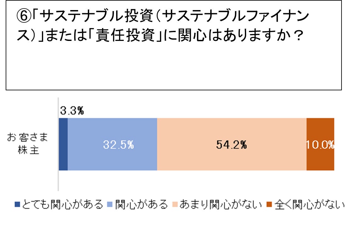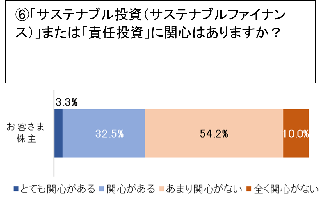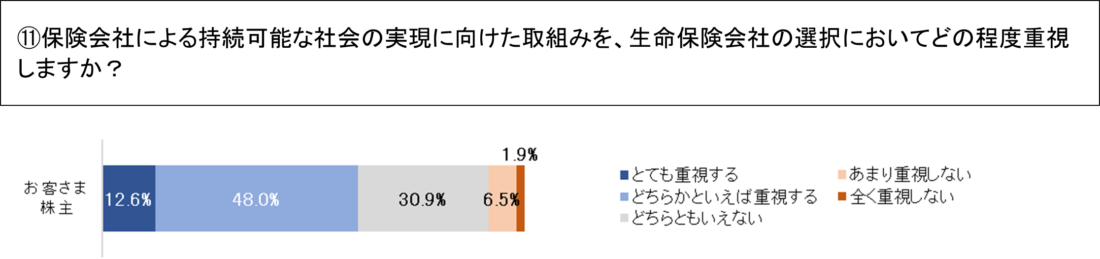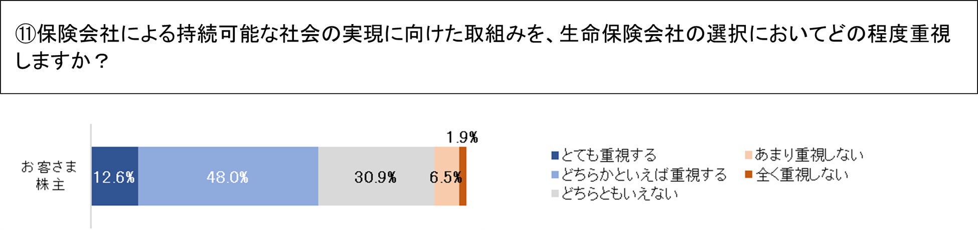 コア・マテリアリティの一つである「Proactive Governance and Engagement」の取組みの一環として、当社グループが持続可能な社会の実現に向けた取組みを推進するにあたり、お客さま、株主、社員をはじめとする多様なステークホルダーの皆さまのご意見やご期待に真摯に耳を傾けることが重要であると考えています。この考えのもと、ステークホルダーの皆さまがサステナビリティに対してどのような認識や価値観をお持ちかを把握するとともに、当社グループが推進するサステナビリティ関連の取組みに対する理解を一層深めていただくことを目的として、「サステナビリティに関するアンケート調査」を実施しました。本アンケートでは、SDGs・サステナビリティおよび責任投資の認知・関心、地域・社会の課題解決への取組みへの認識、関心の高いテーマ、保険会社選択における重視度合いを把握する設問を設けています。今後も継続的なアンケート調査を通じてステークホルダーの認識を把握し、認知度・理解度の向上や社員の意識醸成を図るとともに、当社グループは、地球環境および地域・社会の課題解決に資する価値の提供を通じて、サステナブルな社会の実現に貢献してまいります。