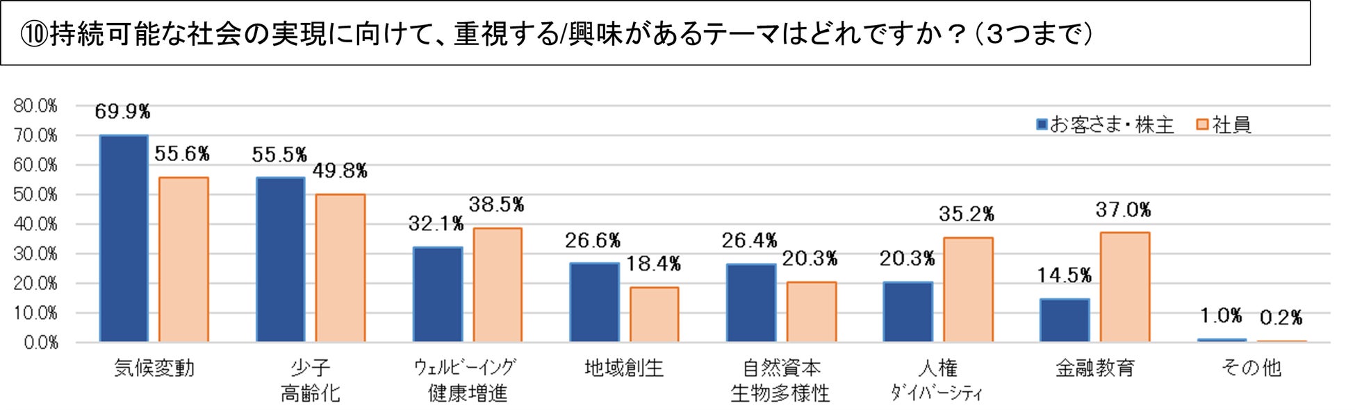 ・テーマ別の関心度では、気候変動、少子高齢化、ウェルビーイング・健康増進については、お客さま・株主と同様に高い関心が寄せられている。加えて、金融教育や人権・ダイバーシティに対しても高い関心が示されている。
