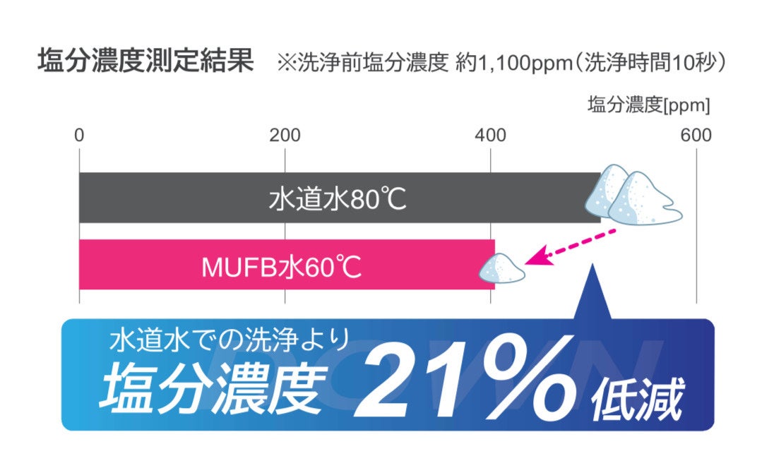 「MUFB温水洗浄機」は、直径1マイクロメートル未満の小さな気泡であるウルトラファインバブルが汚れの隅々まで入り込んで汚れを剥離することで、洗浄力向上と洗浄時間の短縮を実現し、水の使用量や燃料使用量の削減に貢献する環境にやさしい製品です。特に、寒冷地での融雪剤や沿岸部での潮風などによる塩害に対しては、80℃の水道水を使用したときに比べ60℃のウルトラファインバブル水で塩分濃度を約21%低減、油汚れについては、約1%の除油を完了させる作業時間を3分の2に短縮、という効果的な結果が得られています(丸山製作所調べ。実施条件・測定結果は下図参照)。