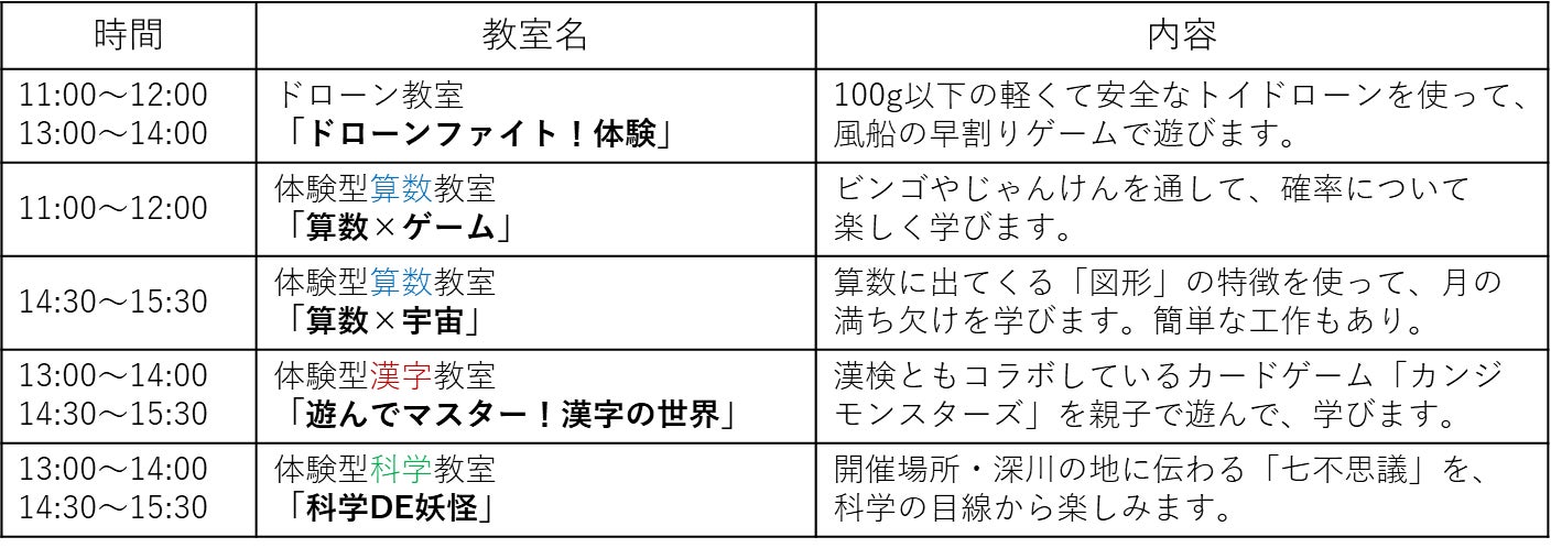 今回はドローン、算数、漢字、妖怪をテーマにした5種類の教室を開催!最新技術から妖怪まで、多彩な分野でお子さまの好奇心を刺激します。体験型の楽しいプログラムを通じて、お子さまだけでなく、保護者の皆さまにも「なるほど!」と思っていただける学びの時間をお届けします。