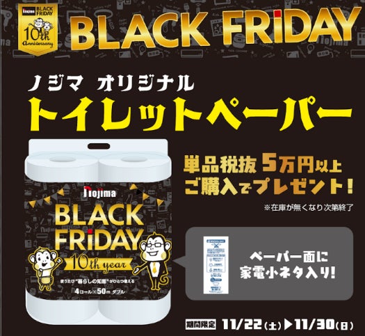 ノジマブラックフライデー10周年を迎える本年は、パワーアップして最長となる23日間での開催となっており、11月8日(土)からの第1弾ではお買い物で最大3万ポイント還元のキャンペーンを開始、第2弾ではブラックフライデーにちなみ「ブラッ96(クロ)」プライス商品の展開を行ってまいりました。第3弾では家計応援として、家電豆知識つきのオリジナルトイレットペーパーをプレゼントいたします!