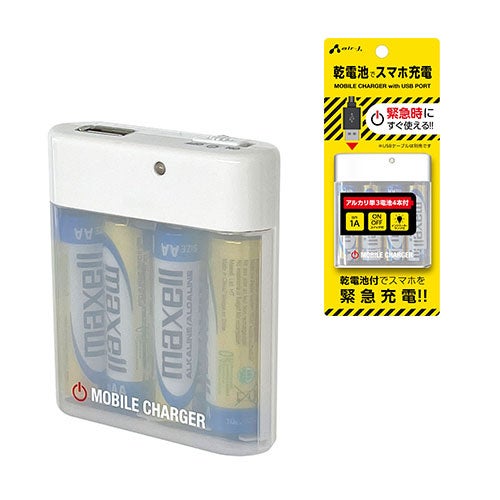 単3形アルカリ乾電池4本を使用する、コンパクトなUSBポート搭載の乾電池式充電器。災害時・緊急時にも重宝します。
