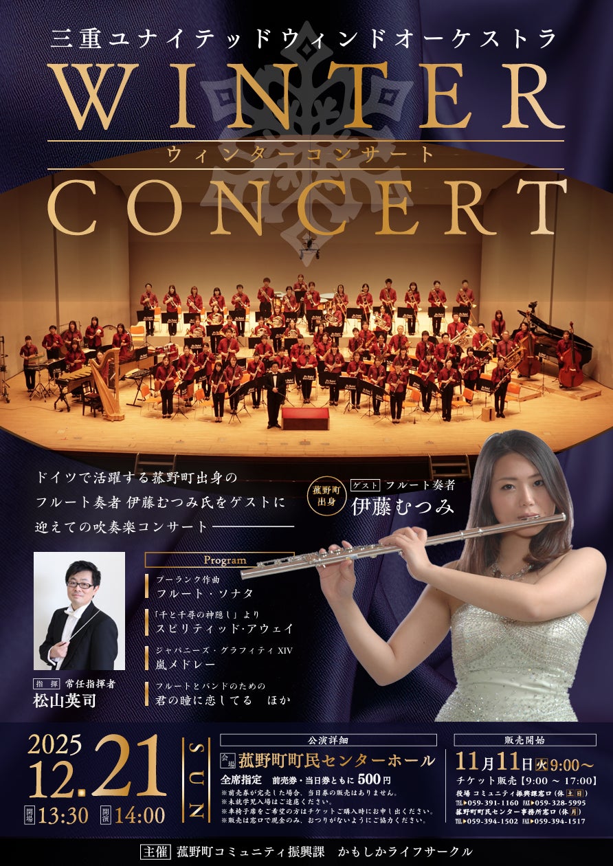 12月21日(日)、菰野町町民センターにおいて三重ユナイテッドウィンドオーケストラウィンターコンサートを開催します。菰野町出身のフルート奏者 伊藤むつみ氏をゲストに迎えお送りします。