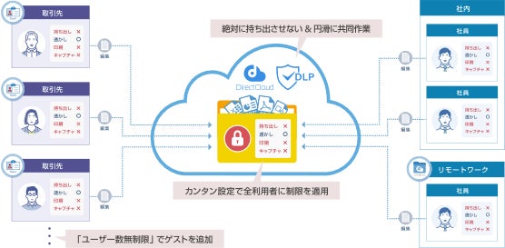 その背景の中、新しく追加された DirectCloud-SHIELD DLP は、DirectCloud上の特定エリアに保存されたファイルを外部へ持ち出すことを防ぐ技術です。これによってクラウド上にファイルを閉じ込めた状態で共同作業を行うことができ、情報を「持ち出させない」まま、社内外のコラボレーションが実現します。