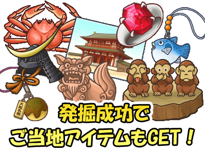 日本地図上に示された埋蔵ポイントに行くと、発掘ゲームがスタート!みごと発掘成功すると、地図上にどんどん発掘クリアした箇所が描かれていく!自分だけのオリジナル地図を眺めてめて、満足感にひたれます。