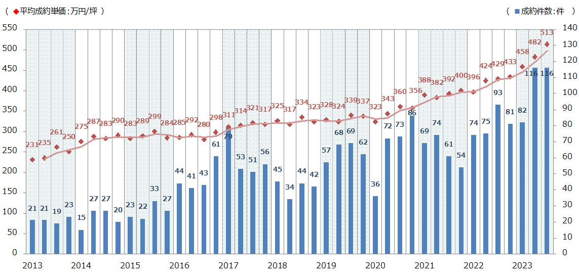 平均成約坪単価513万円と集計開始以降最高値を更新、