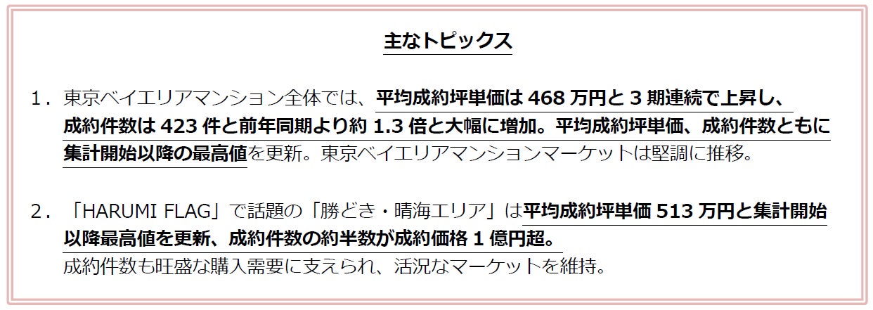 ~東京ベイエリアマンション全体で平均成約坪単価、成約件数ともに集計開始※1以降最高に「HARUMI FLAG」で話題の「勝どき・晴海エリア」は取引の約半数が成約価格1億円超~