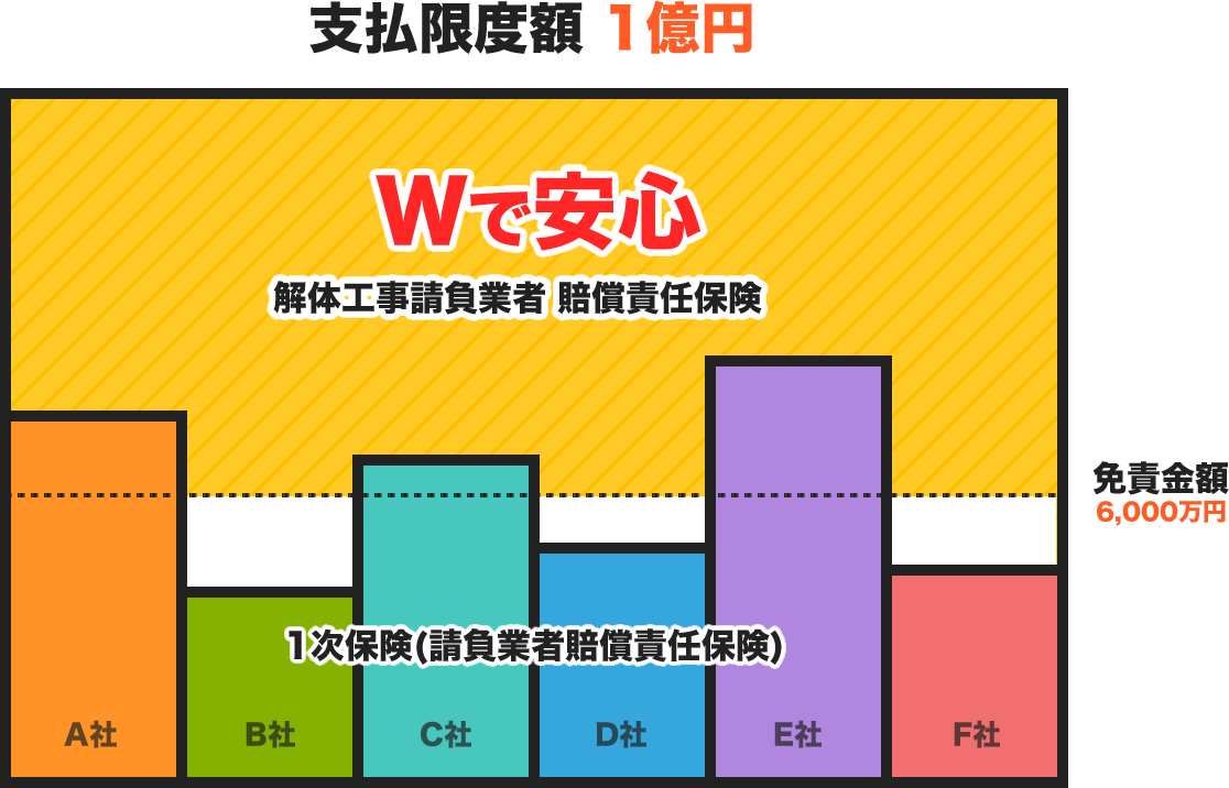 解体業者の皆様が加入されている請負業者賠償責任保険の支払限度額を超える高額賠償事故が発生した場合、弊社が加入する保険で1億円を限度に補償いたします。