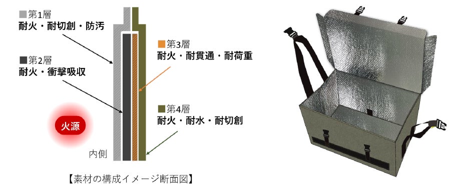 本製品は廃棄物収集を行う自治体および民間事業者を主な対象とし、機能に応じて配置した4層の防護素材で構成されたBOXで、発火リスクの高い使用済み二次電池や二次電池を内蔵した小型家電を安全に隔離・保管・搬送することを目的とした製品です。収集物を起因とする発火時の人的被害、収集車両、設備の損傷を抑制し、地域社会への影響の低減及び安定した事業継続(BCP)に貢献します。