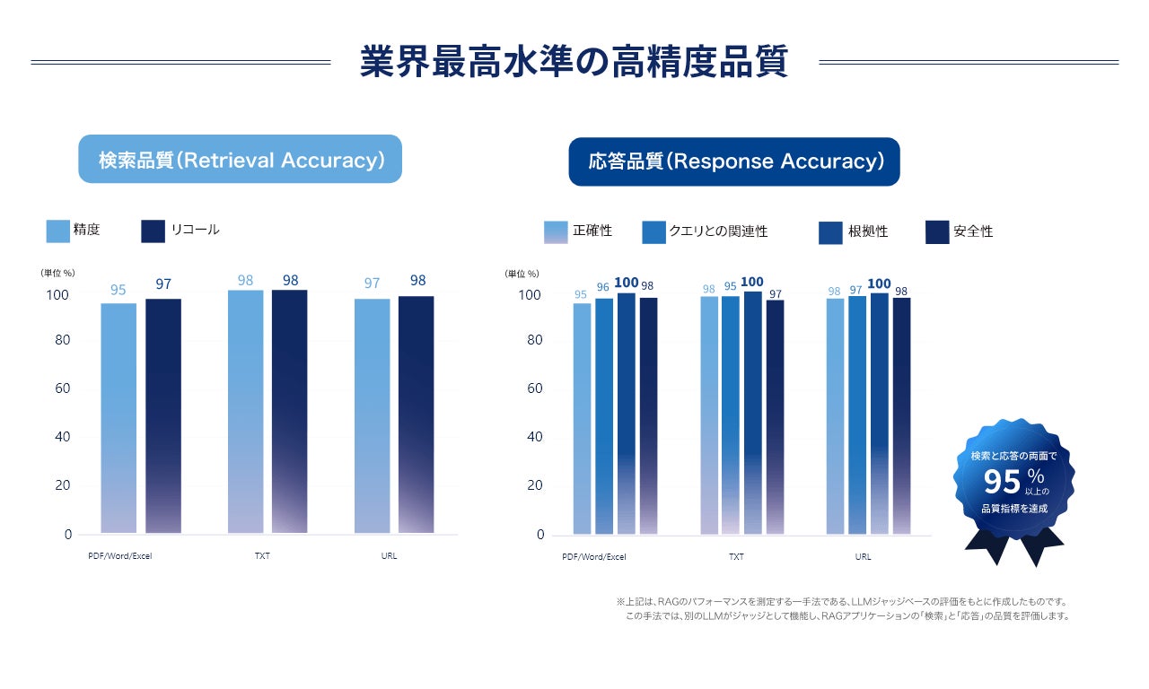 「chai+」は、LLMジャッジベースに基づく検索と応答のパフォーマンス測定において、95%以上の精度を達成。多種多様なドキュメントからの情報抽出においても、正確性と速度を両立させています。